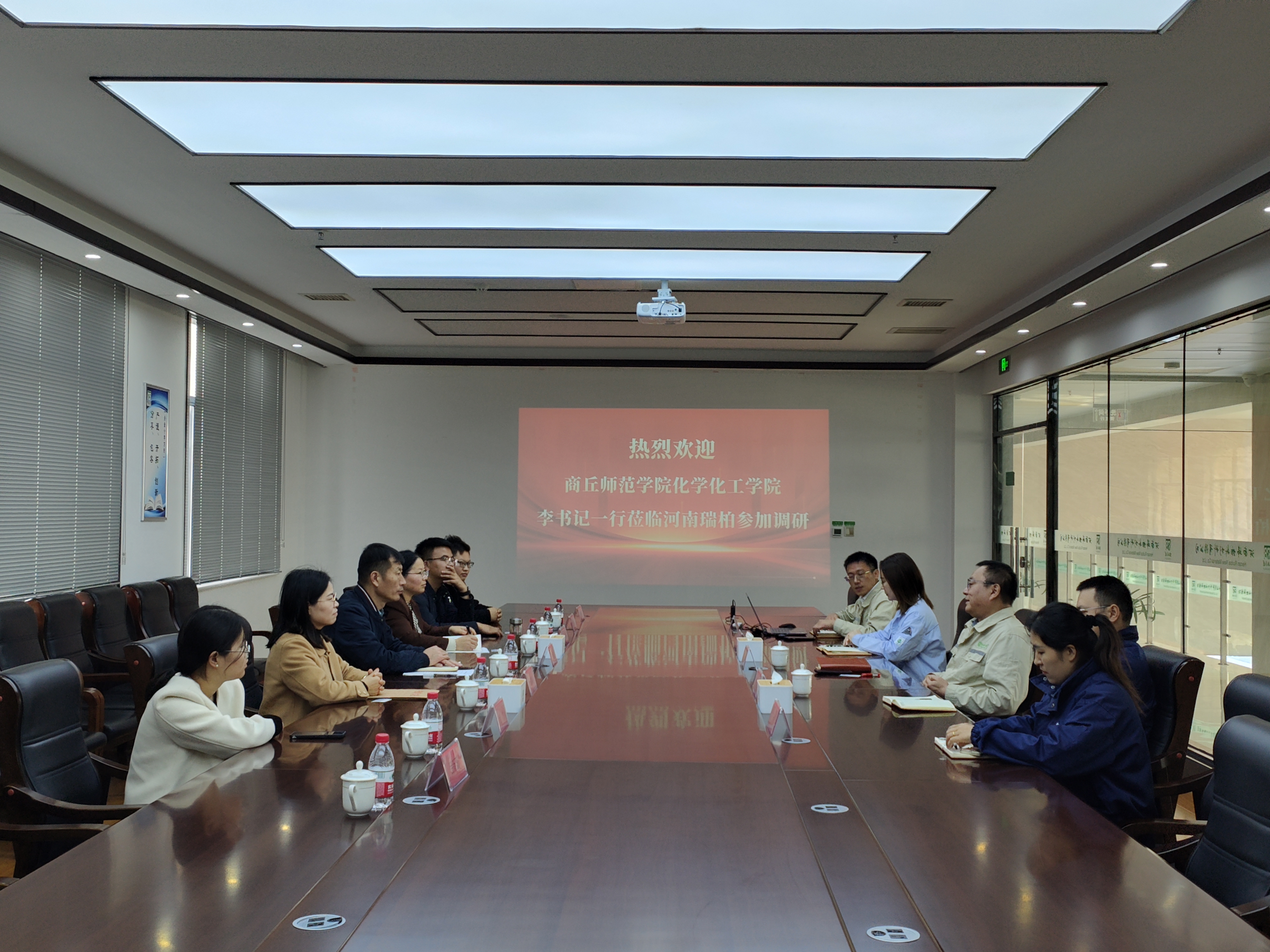 活动当天,beat365英国官网网站党委书记李海涛带领师生代表来到了河南瑞柏新材料有限公司,受到了公司徐西东经理及各位领导的热情欢迎。座谈会上,双方领导就各自单位的情况进行了介绍,并在学生实习实训、毕业生就业、科研项目合作等方面展开深入交流。