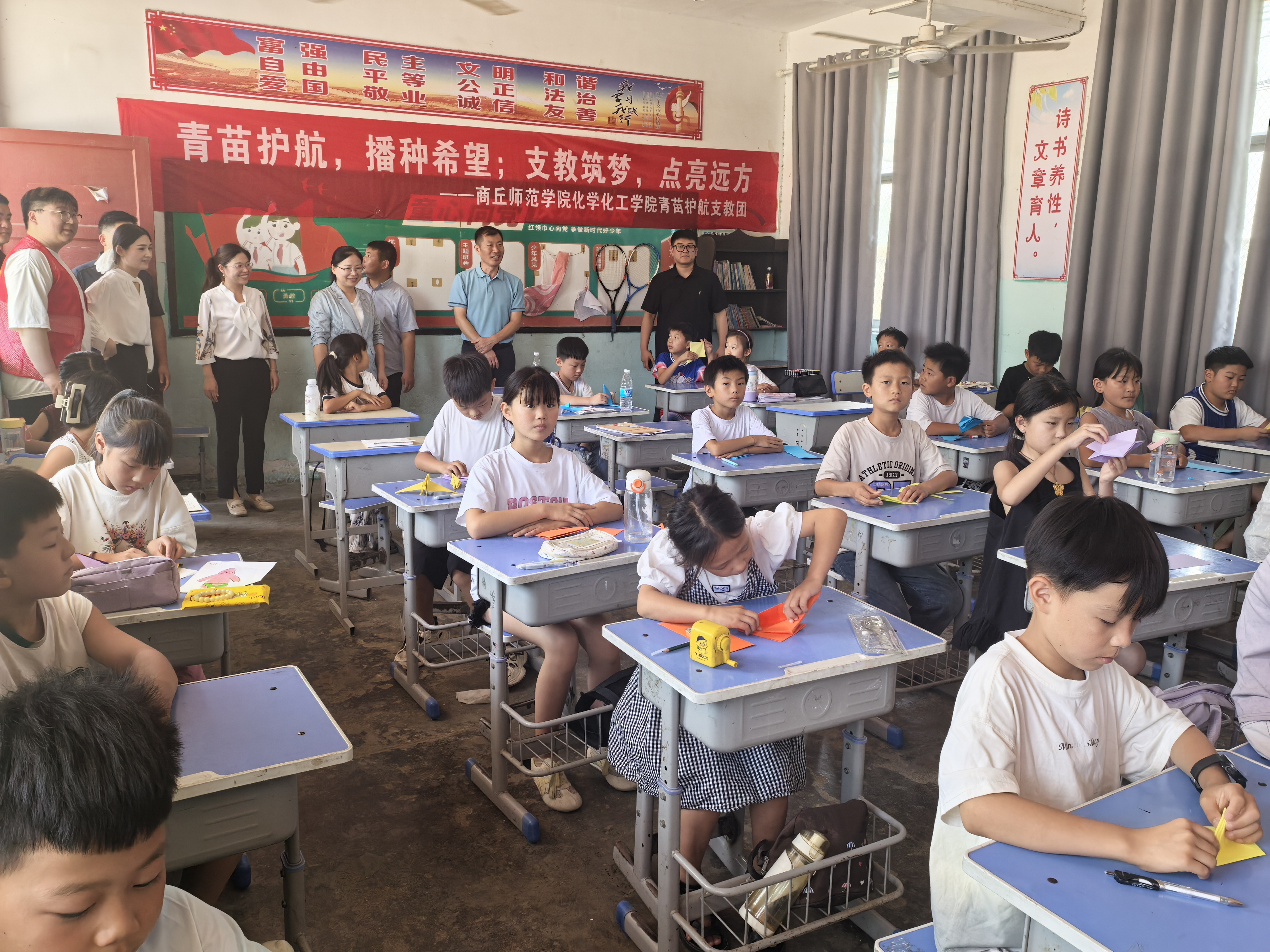 交流结束后,大家走进教室,亲身感受志愿者们的风采。在这个特别的暑期,志愿者们化身为孩子们的知心伙伴,用满满的爱心与耐心陪伴在他们身边。对于孩子们在学习中遇到的难题,志愿者们耐心辅导,帮助他们攻克一个又一个难关。