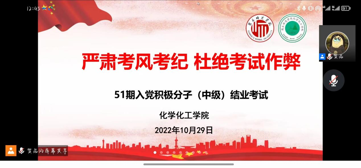 为把好党员发展质量关,检验入党积极分子的学习培训成果,beat365英国官网网站于10月29日在线上举行第51期入党积极分子(中级)培训结业考试。院团委副书记郭家瑞同志、学生第三党支部书记郭冠群同志担任监考员。
