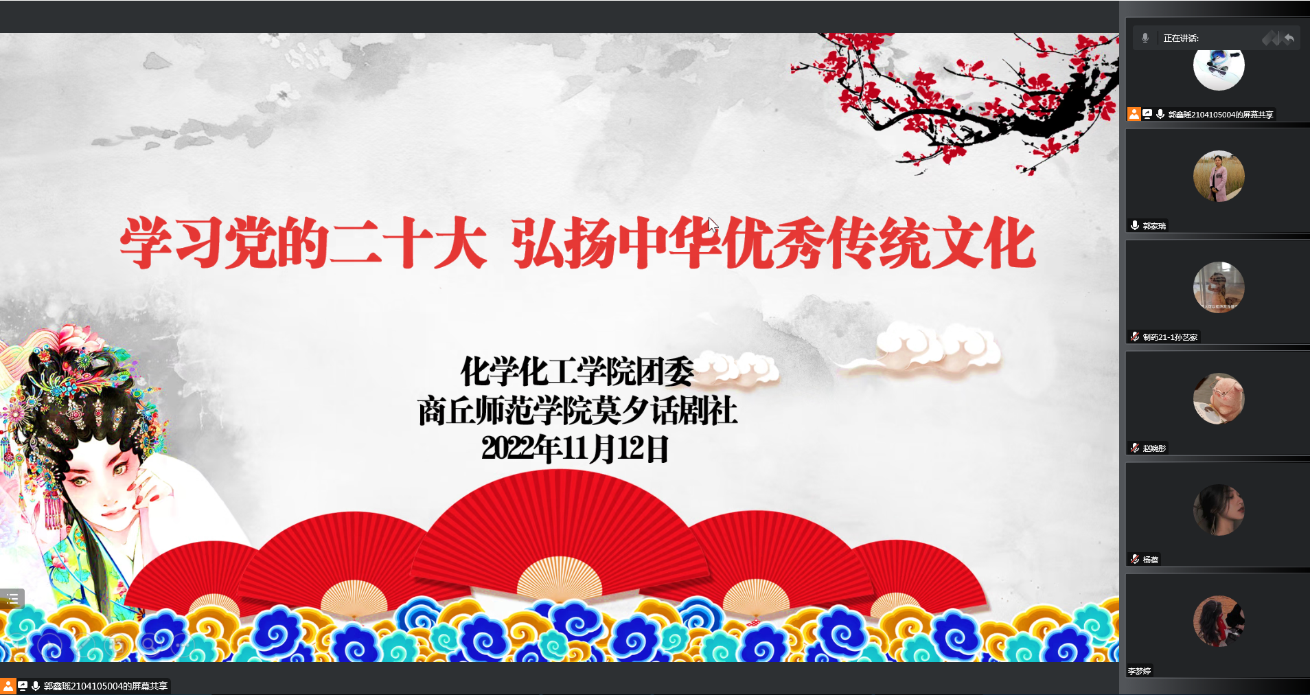 为了深入学习党的二十大精神,更好地弘扬中华优秀传统文化,争做奋进新青年,11月12日,beat365英国官网网站团委和beat365英国官网网站莫夕话剧社在线共同开展了“学习党的二十大,弘扬中华优秀传统文化”主题讲座,邀请音乐学院院长张媛做了“品鉴戏曲之美,传承民族文化”主题讲座。beat365英国官网网站院长张银堂、院党委副书记张颜梅出席活动。全校200余人参加活动。