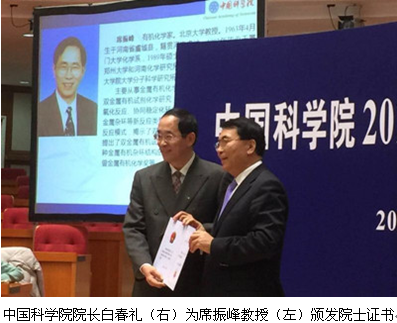 【人物简介】席振峰,河南省虞城县人,1963年生,1983年本科毕业于厦门大学化学系;1983-1992年在河南化学研究所工作和学习;1989年硕士研究生毕业于南京大学配位化学所、郑州大学和河南化学所(导师:金斗满研究员);1996年博士研究生毕业于日本综合研究大学院大学分子科学研究所(导师:Tamotsu Takahashi教授)。1996-1997日本北海道大学触媒化学研究中心博士后;1997-1998日本北海道大学药学部助理教授;1998年到北京大学化学学院工作,任副教授;1999年任教授。1998年获国家杰出青年科学基金;1999年入选教育部“百千万人才工程”第一、二层次人选;2000年获香港求是科技基金会“杰出青年学者奖”;2001年被聘为长江学者计划特聘教授;2002年4月至2006年5月任北京大学化学学院院长;2005年作为学术带头人获“国家自然科学基金委员会创新研究群体”基金;获2003-2004年度中国化学会-巴斯夫“青年知识创新奖”、2004年中国化学会首届“黄耀曾金属有机化学奖”、2005年“中国礼来科技贡献奖”、2007年“药明康德生命化学研究奖一等奖”、2014年“阿克苏诺贝尔化学奖”、2015年“宝钢优秀教师特等奖提名奖”等。