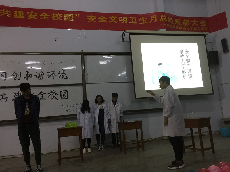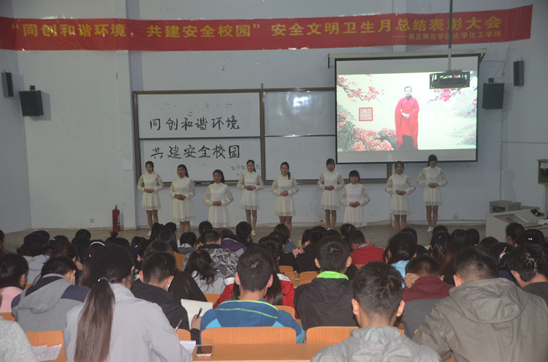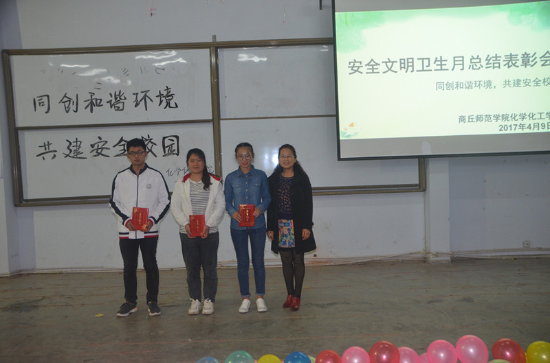 会议伊始,首先以VCR的形式展示了beat365官网在安全文明卫生月期间的活动成果。接着,以情景再现的形式,生动形象地阐释日常生活中大学生常见的安全问题,蕴含在剧中的意义引起大学生深深的思考。其中情景剧《别忘记锁门》讲述了骗子以推销为借口进入学生宿舍进行诈骗的过程,警示同学们时刻提高警惕,保护自身安全;情景剧《安全源于谨慎》用诙谐幽默的方式,在娱乐大家的同时,也让同学们意识到实验室安全的重要性;手语舞《礼》以其温柔优雅、姿势优美的特点,展现了中华文明礼仪之美。随后,李龙梅老师向beat365官网师生发出了倡议:一、积极行动,以主人翁姿态投身创建活动;二、从我做起,争当创建活动先锋;三、齐心协力,塑造师院美好新形象;四、勤奋向上,严谨求实,勇于创新。随之,刘瑛书记与李龙梅老师对情景模拟大赛和十佳宿舍获奖者进行了颁奖,并合影留念。