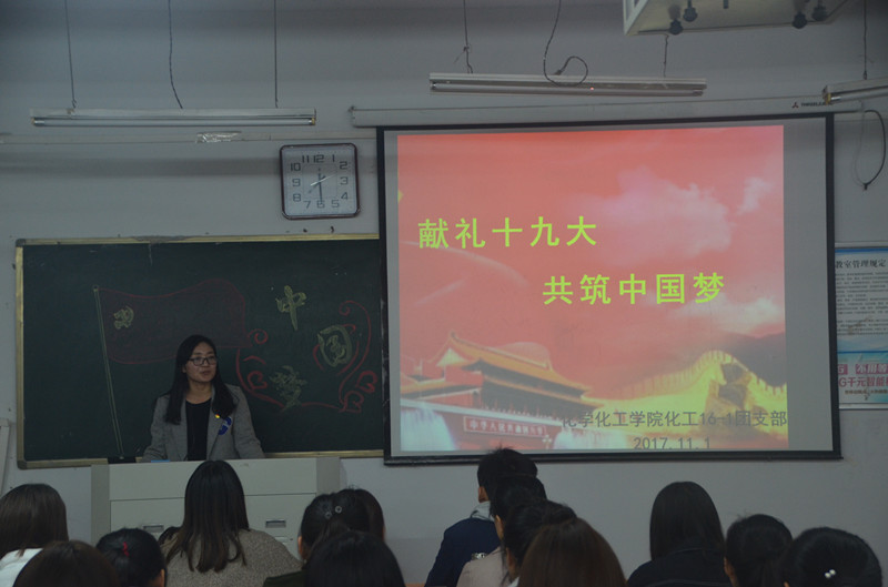 11月1日晚,beat365英国官网网站化工16-1团支部于beat365官网文化路校区1#405教室举办了以“献礼十九大,共筑中国梦”为主题的团日活动,beat365官网团总支书记李龙梅、副书记王宇杰及张太政出席了此次活动,活动由化工16-1团支部的团支书张丽主持。
