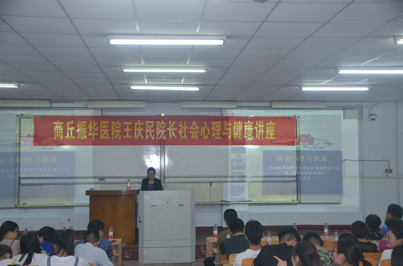 接着,河南医学专科学校管理教研室主任、商丘振华医院执行院长王庆民从健康概述、人类经历的三次卫生革命、影响人类健康的四大危害因素及影响健康的社会诸因素概述四个方面为大家带来了一场视听盛宴——“社会心理与健康”讲座。王院长对社会医学与心理健康做了认真细致的讲解,旁征博引、深入浅出、通俗易懂、实用性强,使大家对“健康”有了更深入的理解。此外,王院长还送给大家“少吃多动,少荤多素,合理营养,适量运动”四句话,希望大家都能够拥有一个健康的身心。现场气氛十分活跃,大家不时被王院长的幽默逗笑,并发自内心的为其热烈鼓掌。
