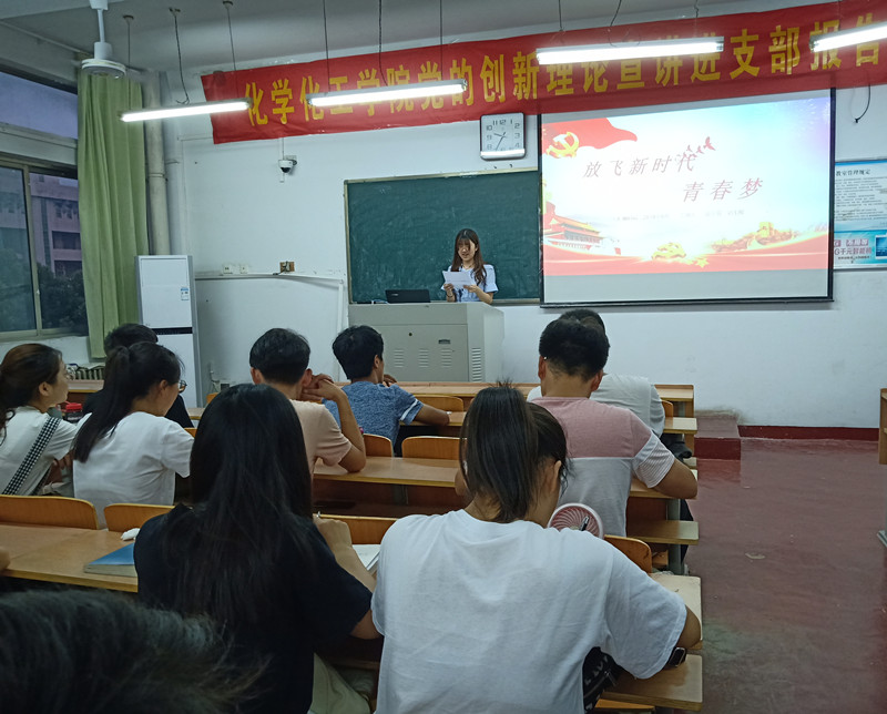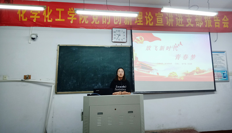 为了认真学习、宣传、贯彻习近平新时代中国特色社会主义思想和党的十九大精神,扎实推动党的创新理论成果深入人心。6月4日晚上七点半,beat365英国官网网站于文化路校区1号教学楼405教室举办“党的创新理论宣讲进支部”报告会,化工17-1、材料17-1班同学参加此次活动,本次报告会由团总支副书记王宇杰主持。