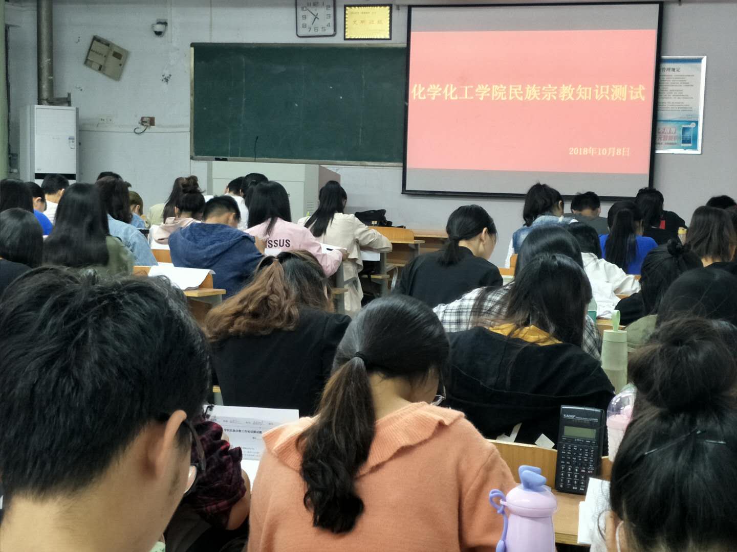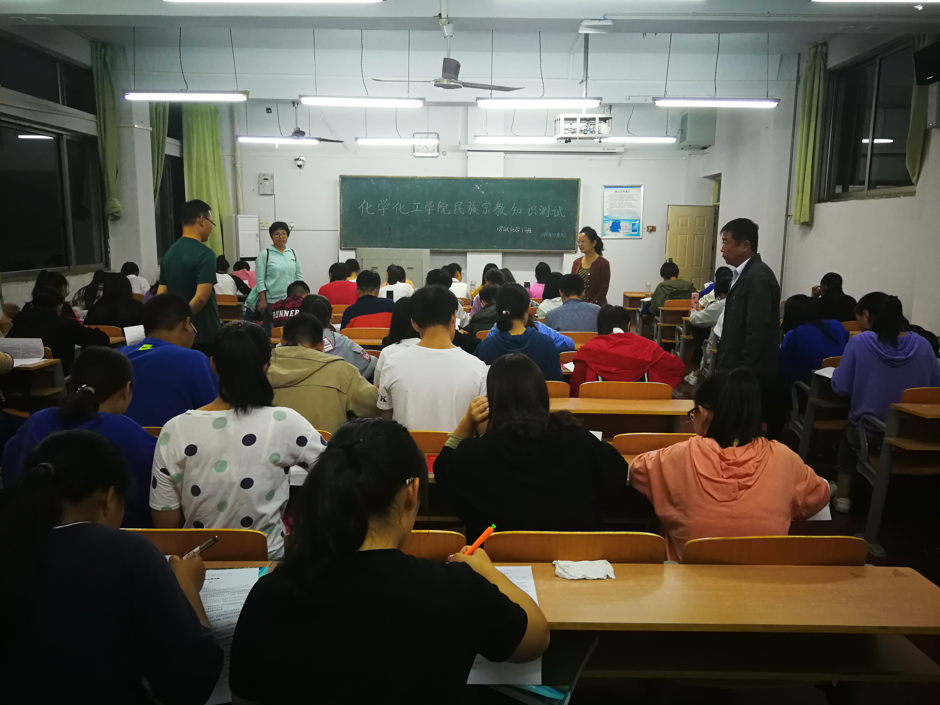 在认真学习《习近平总书记关于民族宗教工作重要论述摘编》和《大学生中国特色社会主义民族宗教理论知识手册》的基础上,10月8日晚,beat365英国官网网站于文化路校区1号、6号教学楼部分自习室进行《习近平总书记关于民族宗教工作重要论述摘编》和《大学生中国特色社会主义民族宗教理论知识手册》等民族宗教工作知识测试竞赛活动。学院16、17、18级全体学生近800名参加了活动,由各班班主任老师监考,党总支书记韩忠民、副书记刘瑛及各年级辅导员巡视。