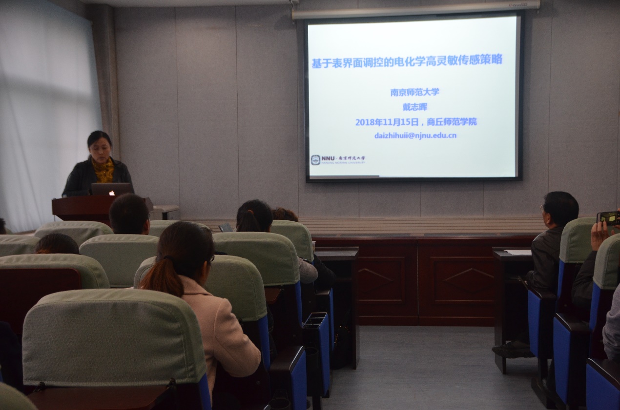 田阳教授报告会的题目为“氧化应激分析化学研究的新进展”,田教授首先介绍了活性氧及氧化应激的类别、产生过程、生理病理的相关性。随后田教授介绍了自己课题组近几年来在氧化应激相关分子离子检测与成像领域的重要研究进展。通过设计引入特异性的识别配体及内参比电信号基团,田教授团队开发了系列用于脑部铜离子、pH及O2原位检测的高特异性比率式电化学分析新方法。此利用特殊结构的核酸载体,田教授课题组还构建了一种线粒体靶向且可同时检测钙离子与pH的多功能DNA纳米探针体系。戴志晖教授报告会的题目为“基于表界面调控的高灵敏传感策略”,戴教授首先介绍了通过表界面调控来构建高灵敏电化学传感体系的整体研究思路。随后戴教授从1.利用金属的电荷调控作用,促进界面电子转移,提高生物传感性能;2.发现材料表界面电荷对电致化学发光效率的影响;3.提出表界面靶诱导聚集的信号积累新方式三个方面讲述了最新研究工作。戴教授课题组从电极材料的设计制备、微观结构性质的表征等方面对所构建的新型电化学传感体系进行了深入系统的阐释。通过精彩的学术报告,两位教授展示了各自独到的科研视角,也让各参会师生深受启迪。