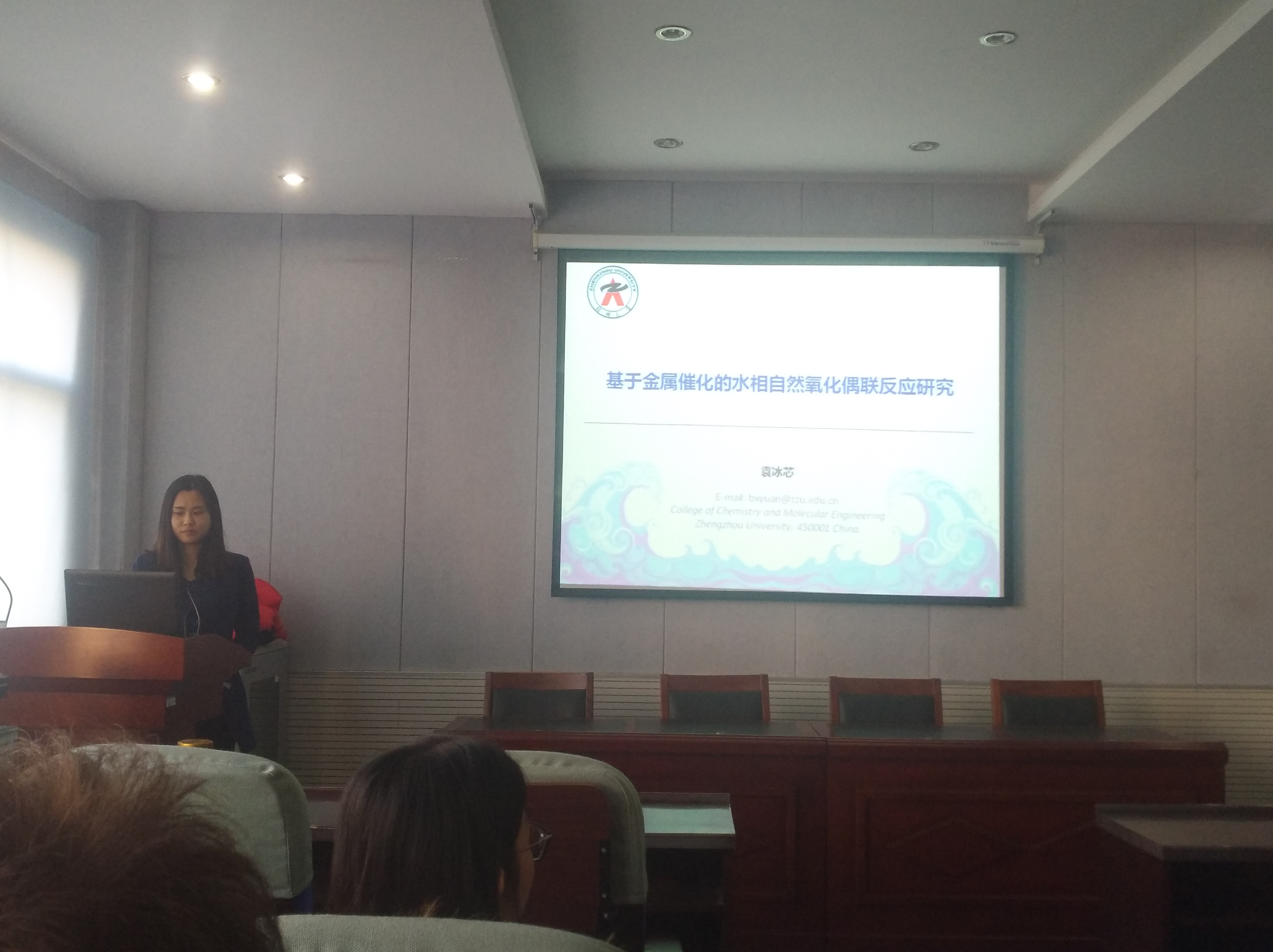 12月12日上午,应beat365官网邀请,郑州大学硕士生导师袁冰芯博士在文化路校区化学实验楼三楼学术报告厅作了题为《基于金属催化的水相自然氧化偶联反应研究》学术报告。报告会由刘澜涛博士主持,beat365英国官网网站部分师生聆听了报告。