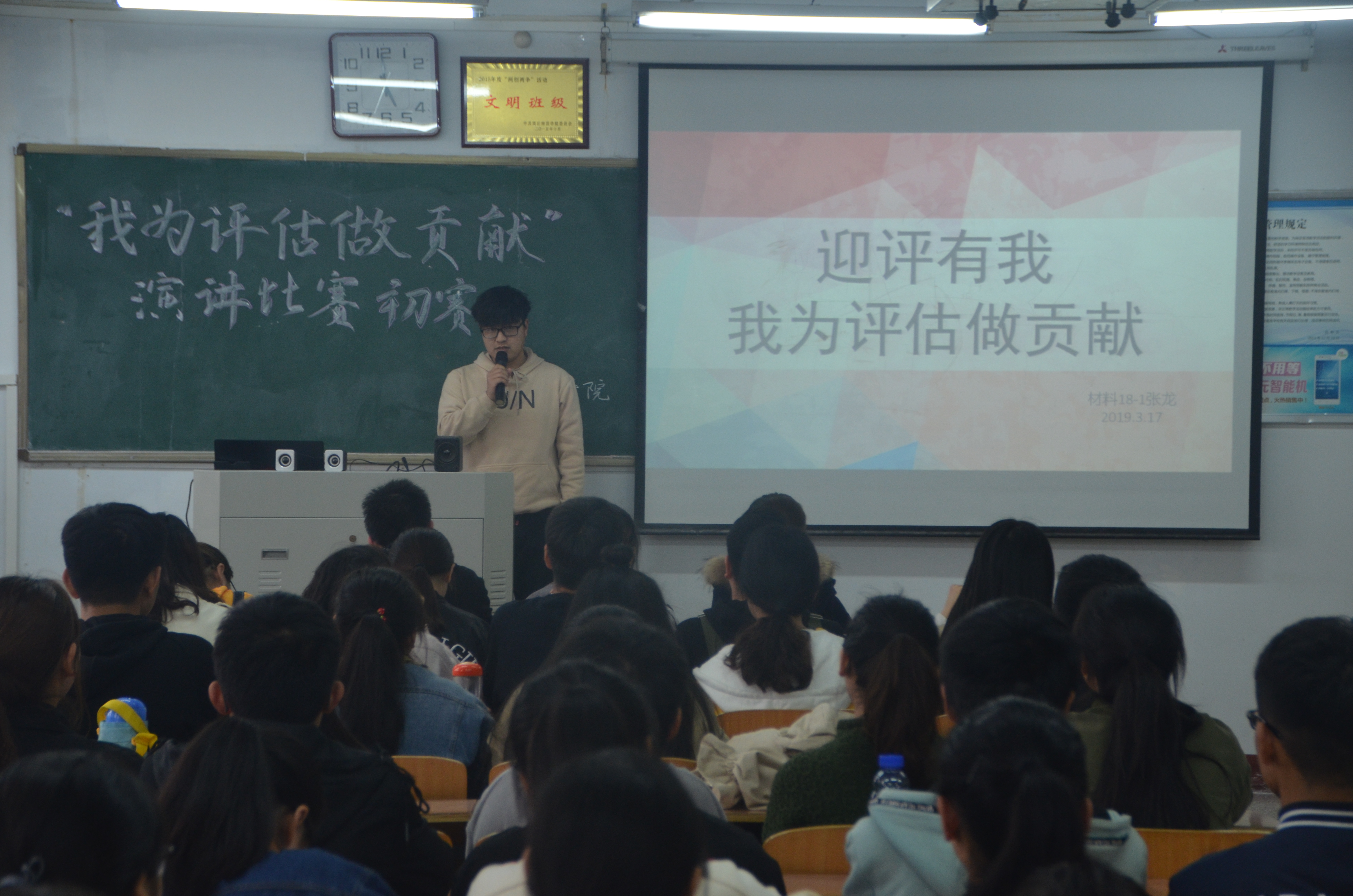 为了使全院同学全方位了解评估工作,形成人人“关注评估,参与评估,了解评估”的良好氛围,以主人翁的精神、饱满的热情和积极的态度投入到本科教学工作审核评估与建设中,beat365英国官网网站3月17日下午于睢阳校区1号楼408 教室举行了“我为评估做贡献”演讲比赛,beat365英国官网网站团总支副书记、学生会主席、副主席担任评委,院团学干部、各班学生代表观看了比赛。本次活动共有14名同学参赛,比赛在主持人激情洋溢的开场介绍中吹响了号角。