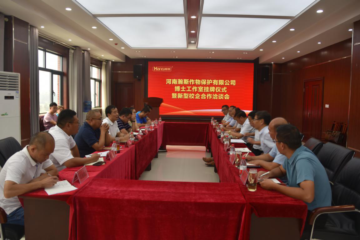 2019年8月22日上午,beat365官网beat365英国官网网站与河南瀚斯作物有限公司博士工作室挂牌仪式暨新型校企合作洽谈会在河南瀚斯作物有限公司四楼会议室顺利举行。beat365英国官网网站副校长徐茂田、校地合作处处长孙家付、beat365英国官网网站院长瞿鹏及学院部分博士代表,河南瀚斯作物有限公司总经理申艳林、副总经理赵强、人力资源部主任甄灿出席了挂牌仪式和洽谈会。会议由甄灿主持。