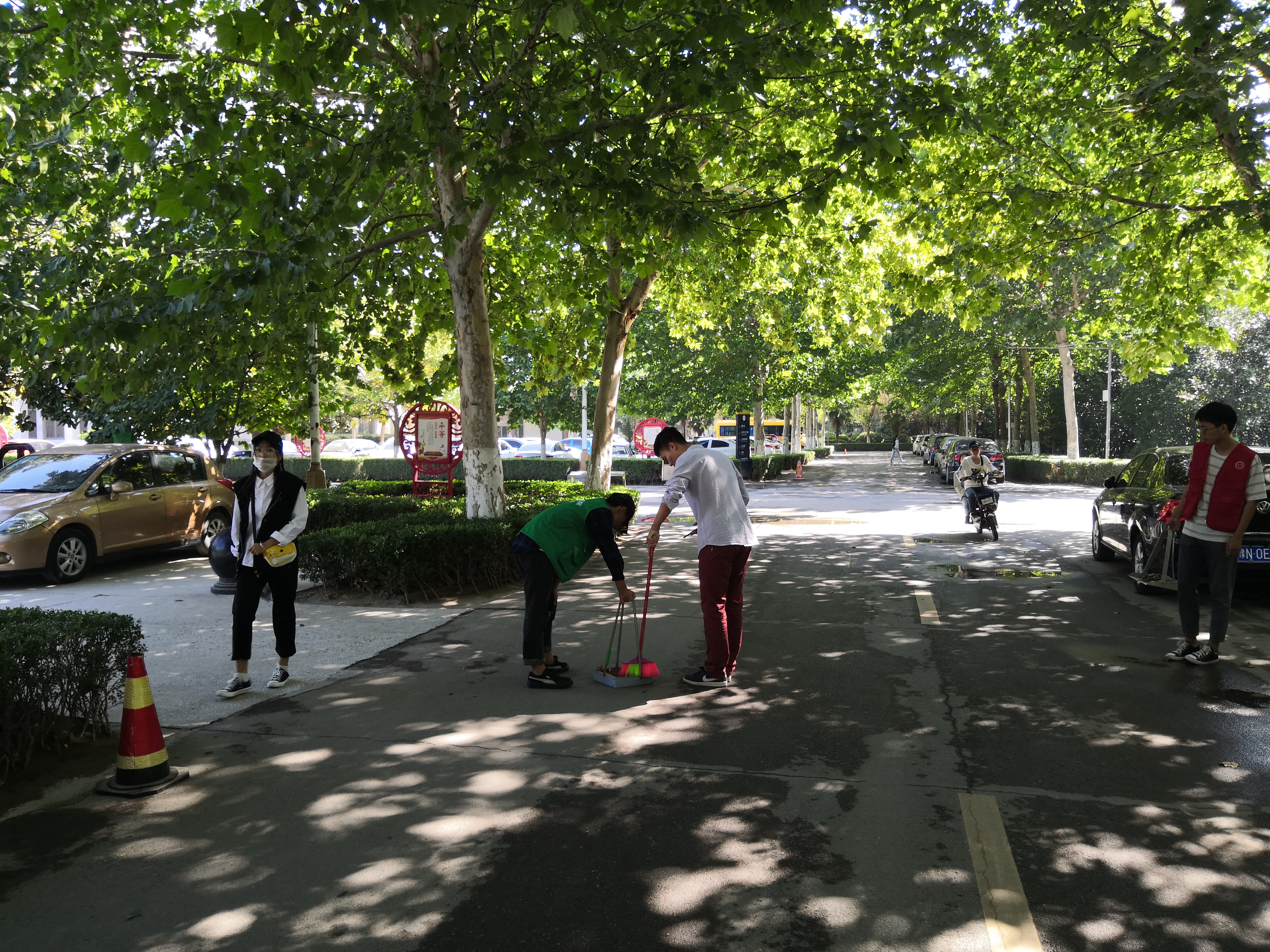 经过简单分工,各小组在所分配的区域内热火朝天地开始劳动。虽然头顶骄阳,但是丝毫不影响同学们的劳动热情。身穿红马甲,绿马甲的同学们穿梭在校园的各条道路,树叶、石子、塑料袋被同学们清理的干干净净,同学们以劳动为荣,乐在其中、配合默契、互相帮助,发扬着不怕脏不怕累的精神。最后大家看着整洁的路面,都感到劳有所获。