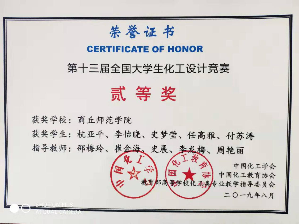 近日,2019年“东华科技-恒逸石化杯”第十三届全国大学生化工设计竞赛圆满落幕。本届化工设计大赛由来自全国范围内共计357所高校的2196支团队报名,最终有343所高校的1318支队伍成功提交作品。在学校领导、相关部门与学院的大力支持下,经过6个月的艰苦备战,我院杭亚平、李怡晓、史梦莹、任高雅、付苏涛五位同学组成的“烯天取经”队在指导教师邵梅玲、崔金海等的指导下,荣获“2019年第十三届全国大学生化工设计竞赛”二等奖。