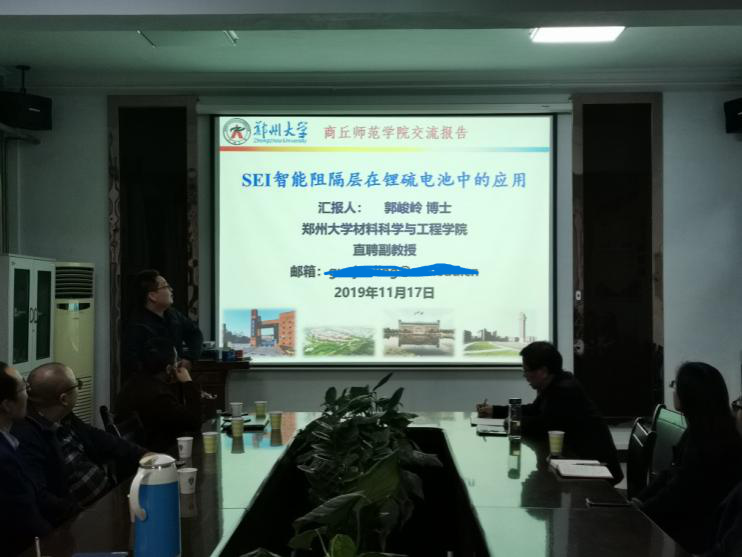 应beat365英国官网网站的邀请,11月17日,郑州大学青年拔尖人才王烨、卢思宇、薛超、郭峻岭四位博士在文化路校区beat365英国官网网站会议室分别做了题为“Printed electronic devices with inorganic materials”、“碳化聚合物点的可控制备及性质研究”、“基于载流子空间分离策略的光催化体系构建与光解水产氢性能研究以及“SEI智能阻隔层在锂硫电池中的应用”的学术报告,报告会由瞿鹏院长主持,beat365英国官网网站部分老师、研究生和本科生聆听了报告。