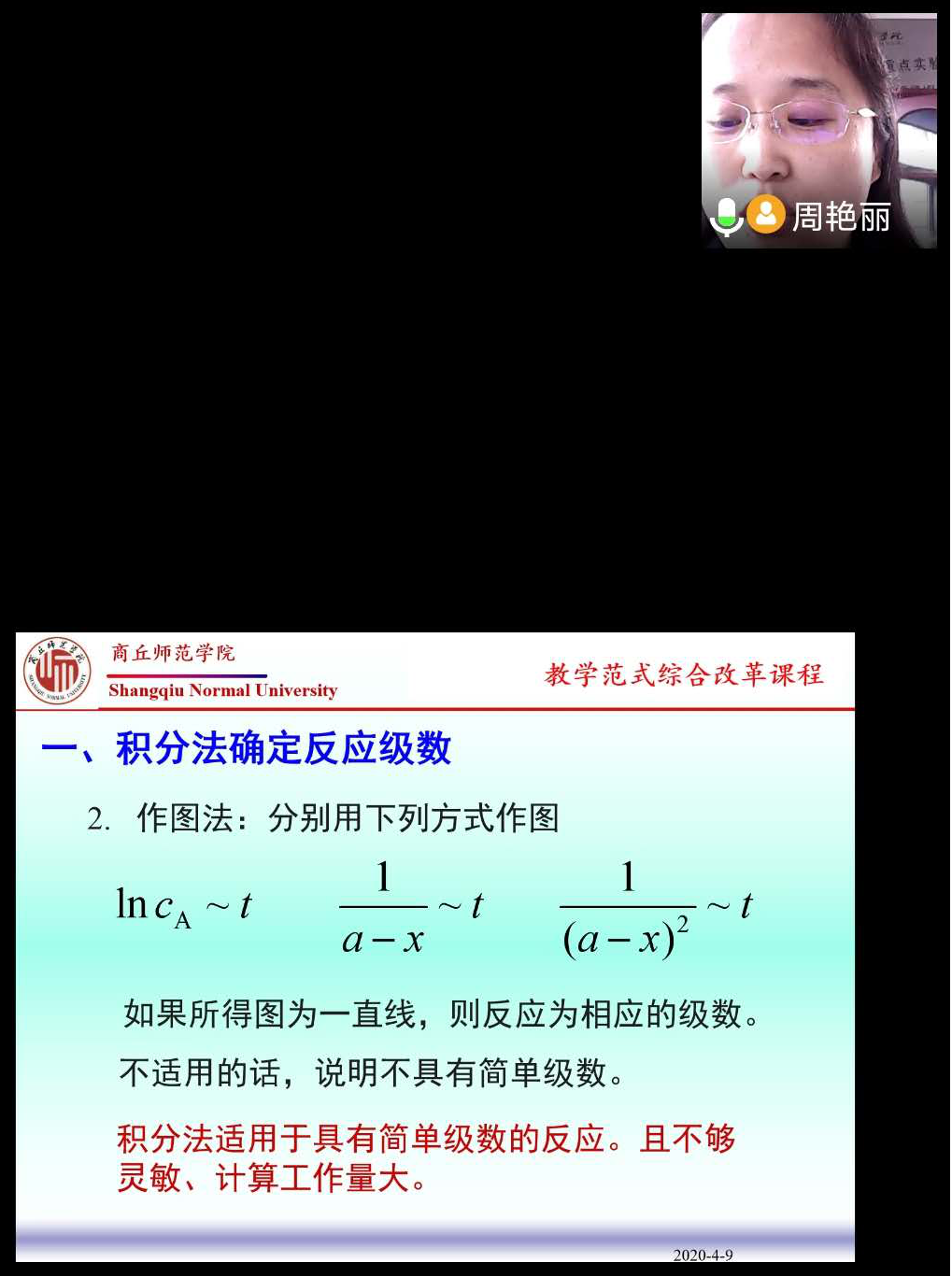 周艳丽老师的《物理化学》课程,课前让同学们通过超星泛雅平台上的课程资料进行预习,课中通过腾讯会议软件进行直播互动,课后的作业、测试和讨论等环节也通过超星泛雅平台进行互动。本次公开课以“反应级数的测定”为例进行课堂展示,主要讲解了反应级数测定的三种方法:积分法、微分法和半衰期法。周艳丽老师针对本节不同的知识要点精心设计了关键问题,随机连麦提问,以问题为驱动,积极启发学生思考,同学们积极回答,气氛热烈活跃。通过此课堂高效地实现了课堂教学目标,提高了学生的学习能力、表达能力、小组协作能力及解决问题的能力,充分体现了“以学生为主体,以教师为主导”的课堂教学理念,展示了学院课程改革的新成果。