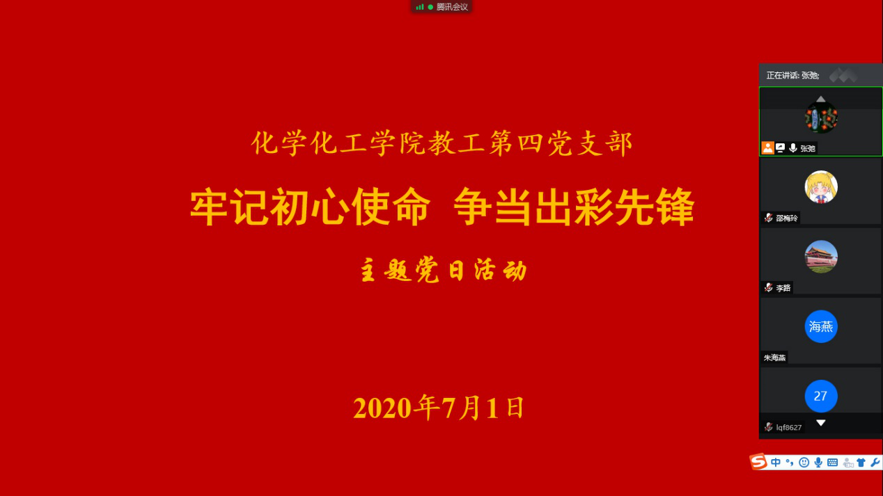 为庆祝中国共产党成立99周年,深化“不忘初心、牢记使命”主题教育成果,beat365英国官网网站教工第四党支部于2020年7月1日在线开展了“牢记初心使命、争当出彩先锋”主题党日活动。