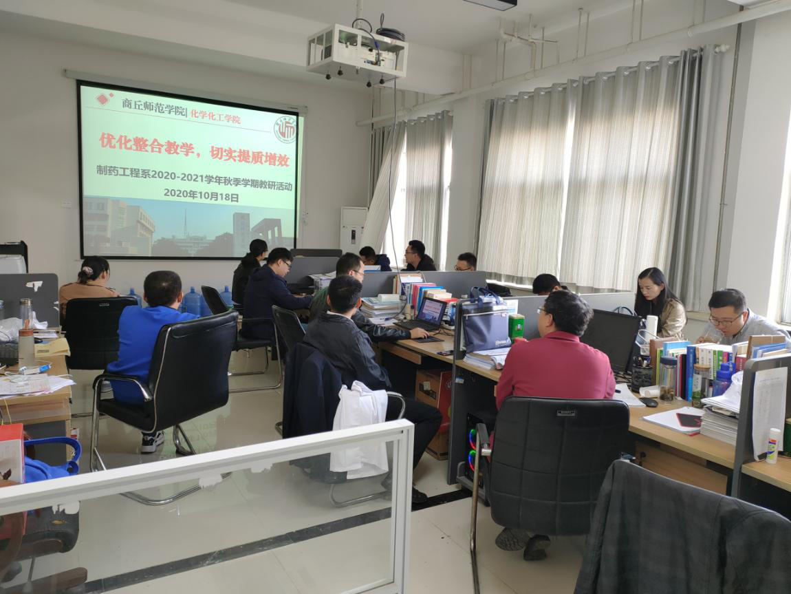 为进一步落实2020版人才培养方案及课程教学大纲的稳步执行,实现课程知识点之间的高效衔接,2020年10月18日制药工程系在化学实验楼416室召开了以“优化整合教学,切实提质增效”为主题的教研活动。教研活动由系主任王涛老师主持,制药工程系全体老师参加此次活动。