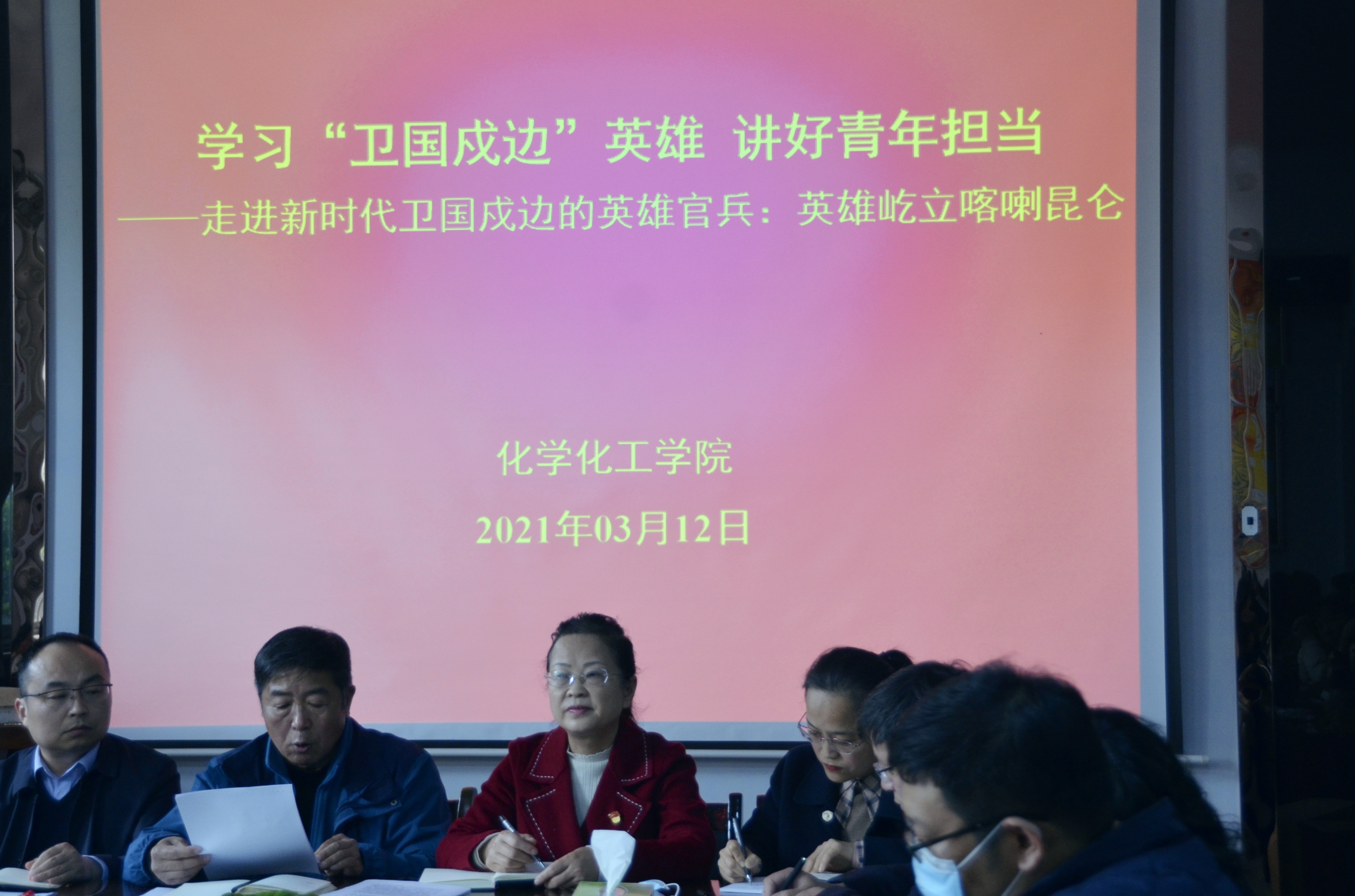 3月12日,化工学院于睢阳校区7号楼会议室举行beat365英国官网网站举行“学习卫国戍边英雄,讲好青年担当”专题学习会议--走近新时代卫国戍边的英雄官兵:英雄屹立喀喇昆仑。会议由beat365英国官网网站党总支书记韩忠民主持,全体教职工参加。