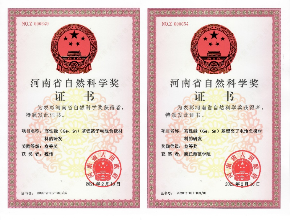 一年来,党支部成员围绕新能源材料领域二次电池、光电催化方向以及新能源材料等方向,先后发表了12篇高水平研究论文,其中影响因子大于10 的有3篇。党支部书记魏伟博士充分发挥“头雁”作用,先后荣获2020年度河南省科学技术三等奖1项,商丘市科技进步一等奖1项,河南省科技厅科技成果二等奖1项,发表SCI一区论文1篇(ACS Appl. Mater. Interfaces 2020, 12, 43543−43552;影响因子8.758)。组织委员王科峰博士、纪检委员胡新成博士各发表高水平论文1篇,党支部成员张建伟博士发表高水平论文3篇,李盼博士发表SCI一区论文4篇,陈稳霞博士发表高水平论文2篇。