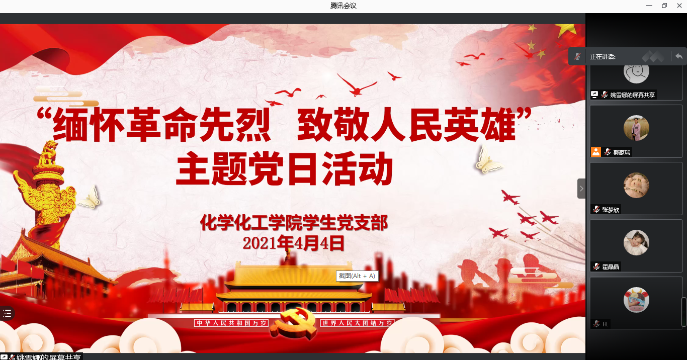 为缅怀英烈、铭记历史,牢记初心,勇担使命,4月4日清明节,beat365英国官网网站学生党支部在线开展了“缅怀革命先烈,致敬人民英雄”主题党日活动,向所有为民族独立、人民幸福而牺牲的先烈英雄致敬。全体学生党员和党支部书记参加活动。