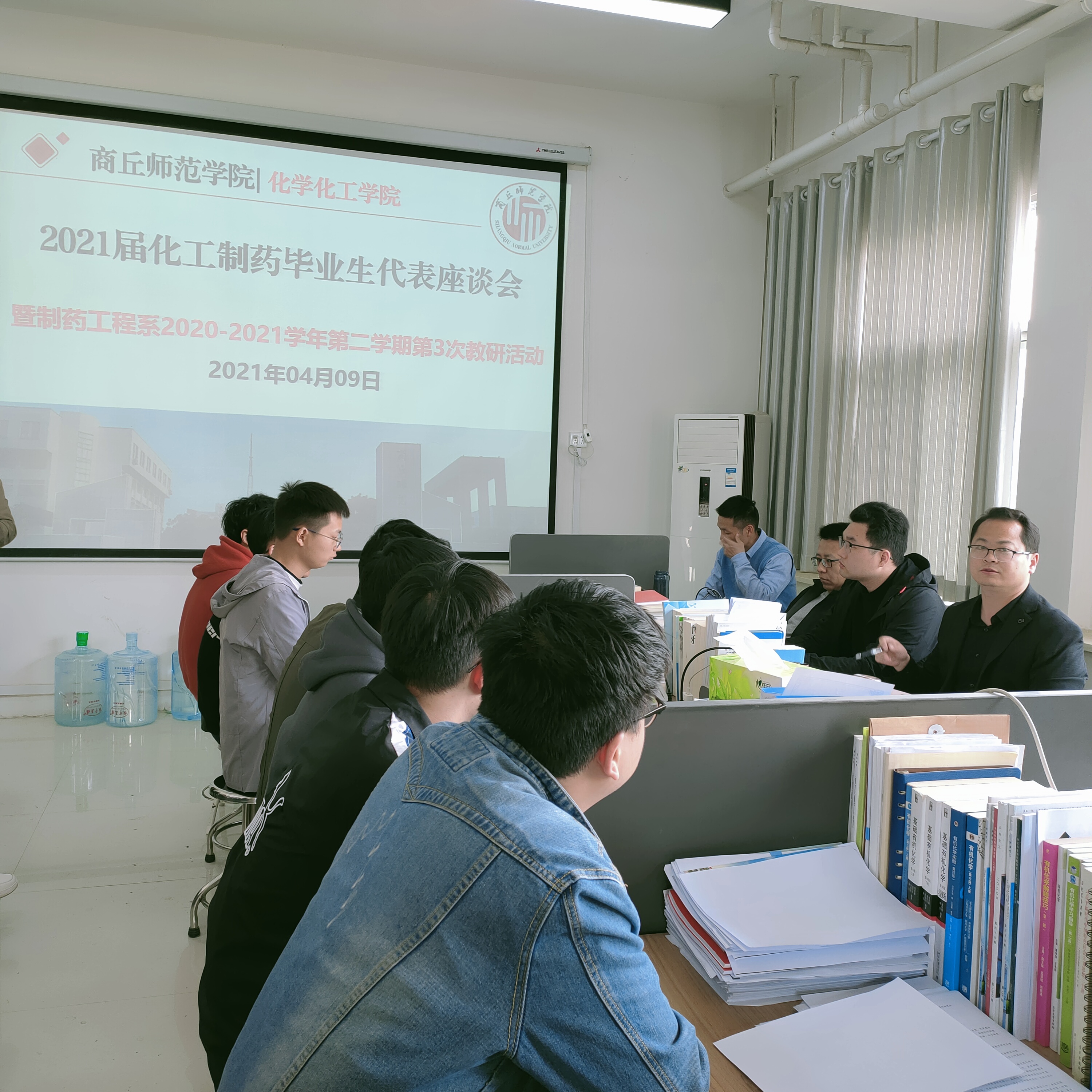 为了进一步提高制药工程专业人才培养质量,推动学院建设发展,2021年04月09日,制药工程系在化学实验楼416室召开了以“2021届化工制药毕业生代表座谈会”为主题的教研活动。教研活动由系主任王涛老师主持,制药工程系全体老师、部分2021届化工制药专业本科毕业生代表参加了此次活动。