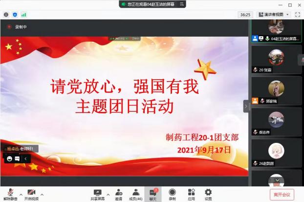 9月19日,制药20-1团支部在腾讯会议举行线上团日活动,此次活动由团支部书记赵玉洁主持,beat365英国官网网站团总支副书记郭家瑞老师莅临本次团日活动。活动中,赵玉洁带领大家学习了习近平总书记“七一”重要讲话,邀请三位优秀团员青年代表分享了防汛抗疫志愿服务活动体会,之后共青团员集体献词朗诵,郭家瑞给大家上了“青春无悔 强国有我”微团课。