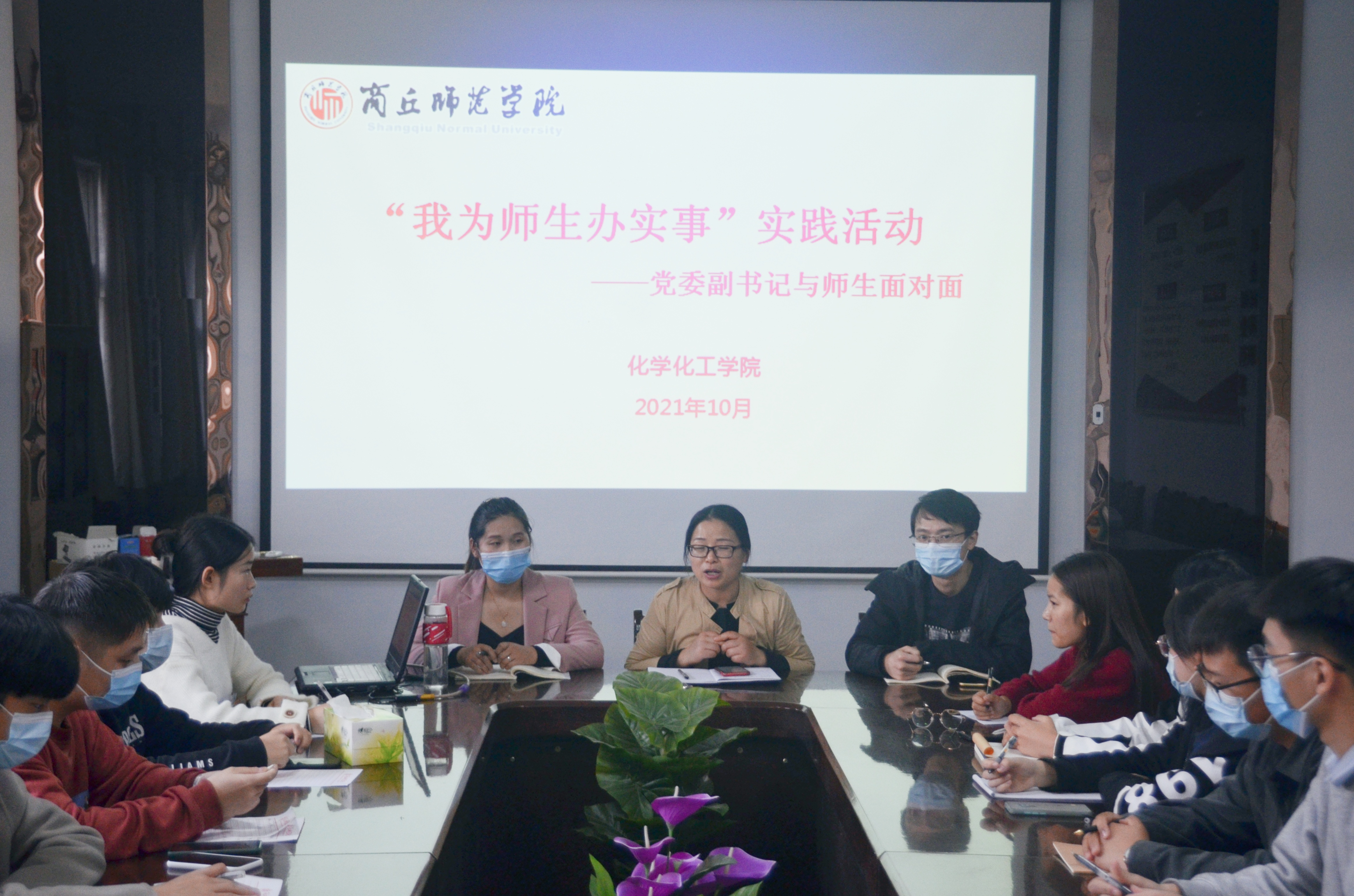为号召广大师生学党史、悟思想、办实事、开新局,将党史学习教育与服务师生相结合,10月13日下午5点,beat365英国官网网站于睢阳校区七号楼会议室召开“我为师生办实事”实践活动。党委副书记张颜梅主持,学工办副主任史展、辅导员李宁娅以及19级、20级班委参加。