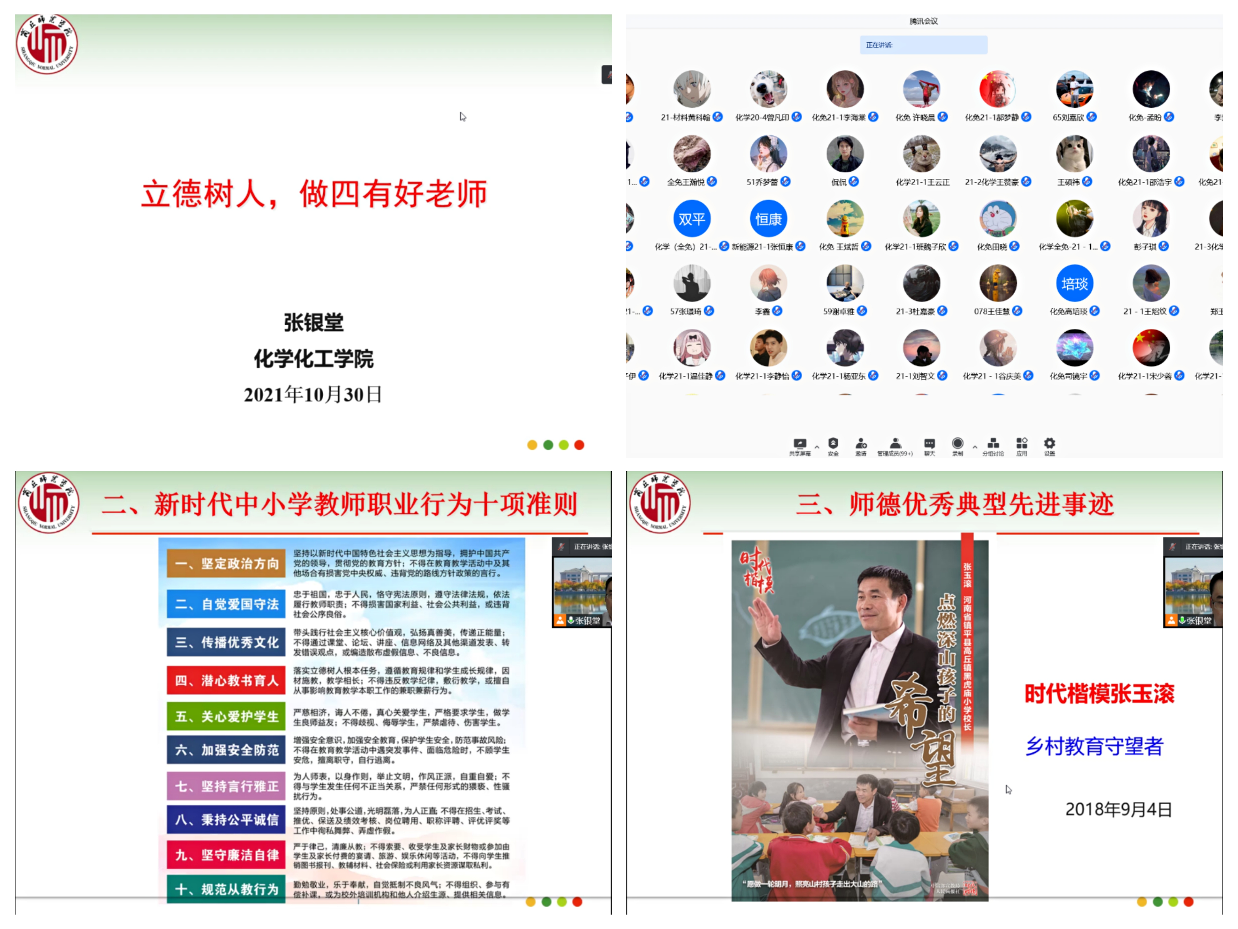 为全面推进师范专业学生师德师风主题教育,10月30日,beat365英国官网网站张银堂院长为21级化学(师范)专业新生做了“立德树人,做四有好老师”为主题的师德师风讲座。