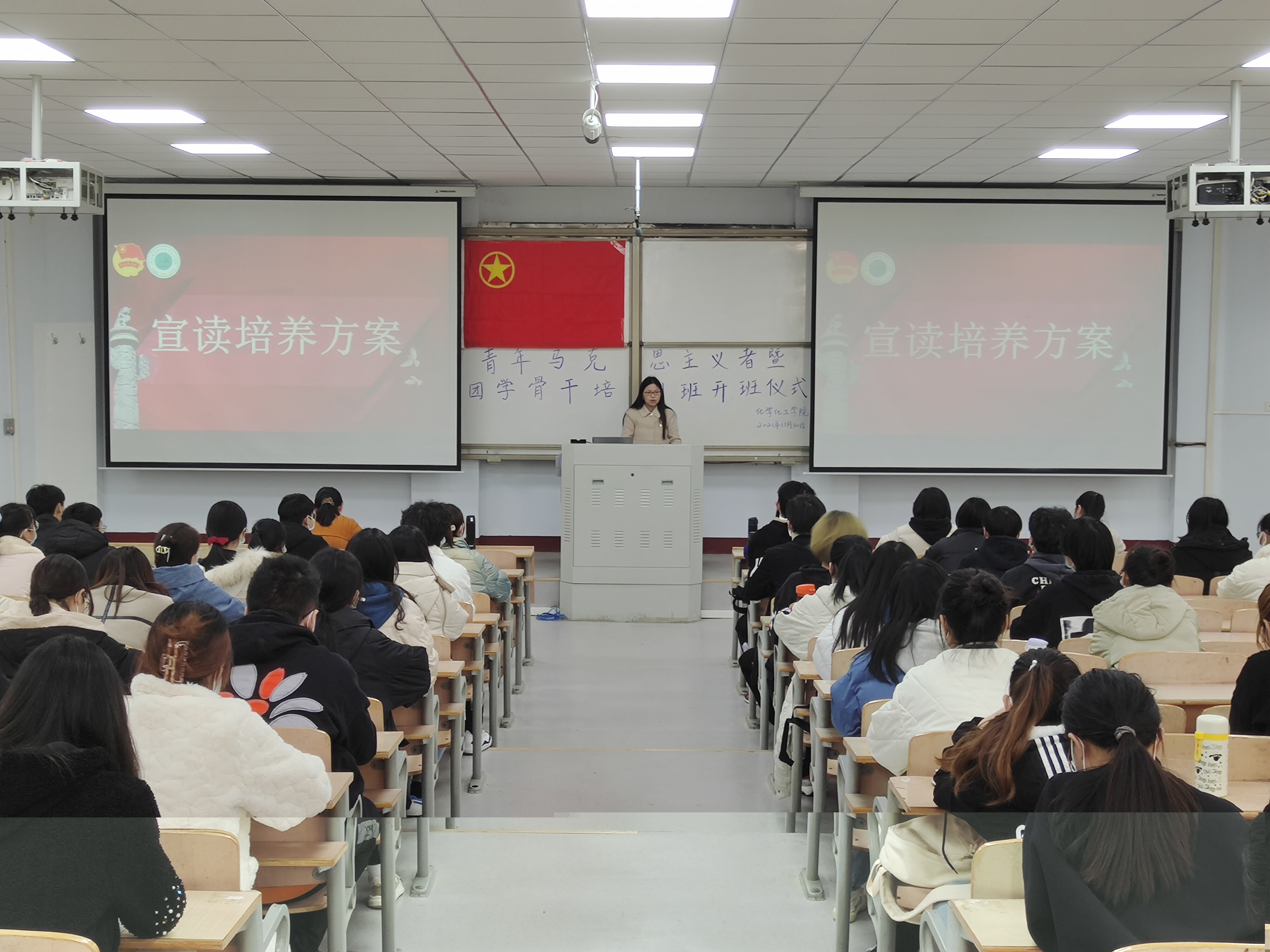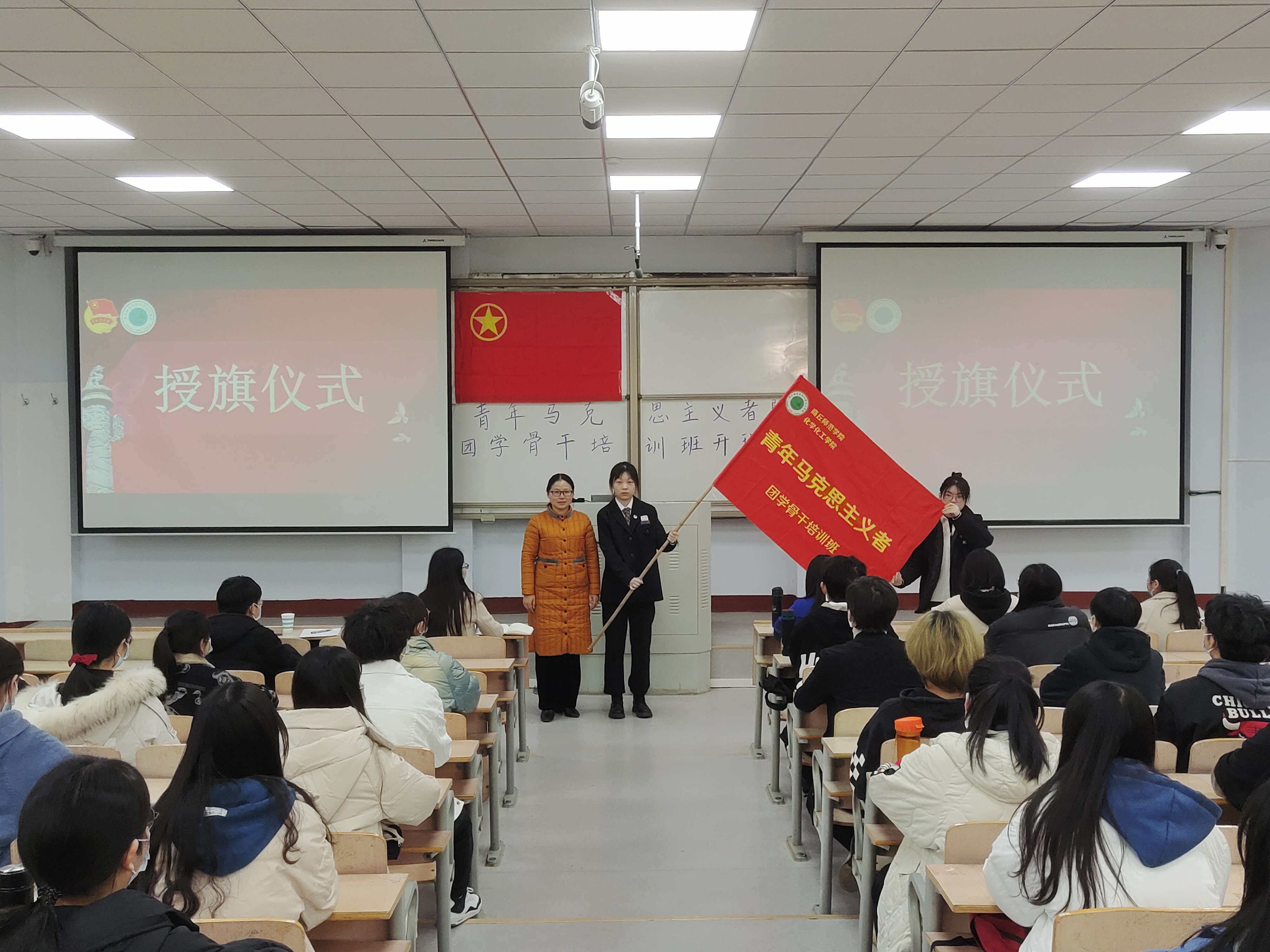 开班仪式在全体成员嘹亮高昂的国歌声中拉开了帷幕,张颜梅对培训学员提出三点希望:一是希望学员充分认识青年马克思主义者培养工程的重大实现意义;二是希望学员珍惜宝贵的学习机会圆满完成本次培训班的各项学习任务;三是希望学员坚持理论联系实际,切实提高履行职责的能力和水平。郭家瑞宣读“青年马克思主义者”培训班培养方案,要求学员严格遵守相关培训管理制度。吴晓洁作为代表发言,承诺会积极参加“青年马克思主义者”培训班课程,严格遵守规章制度,努力学习专业知识,为学校发展建设做出贡献。张颜梅为吴晓洁授旗,仪式在团歌声中闭幕。