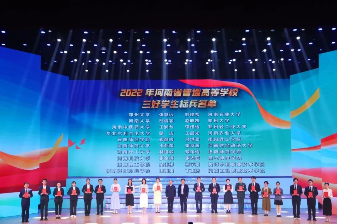 4月23日下午,2022年河南省普通高等学校三好学生标兵颁奖典礼在河南农业大学龙子湖校区举行。省委教育工委专职委员吕冰,河南农业大学党委副书记、校长介晓磊,共青团河南省委副书记王继威,河南农业大学党委副书记游舸,省教育厅思想政治工作处处长陈凯,省教育厅学生工作处处长李班,共青团河南省委学校部部长刘淑丽出席颁奖典礼,beat365官网学生张光亚作为三好学生标兵上台领奖。