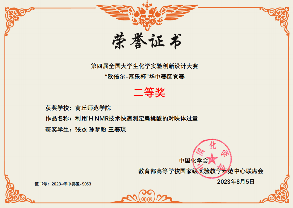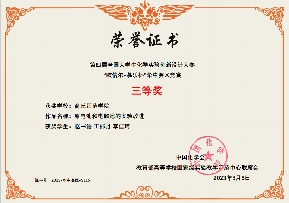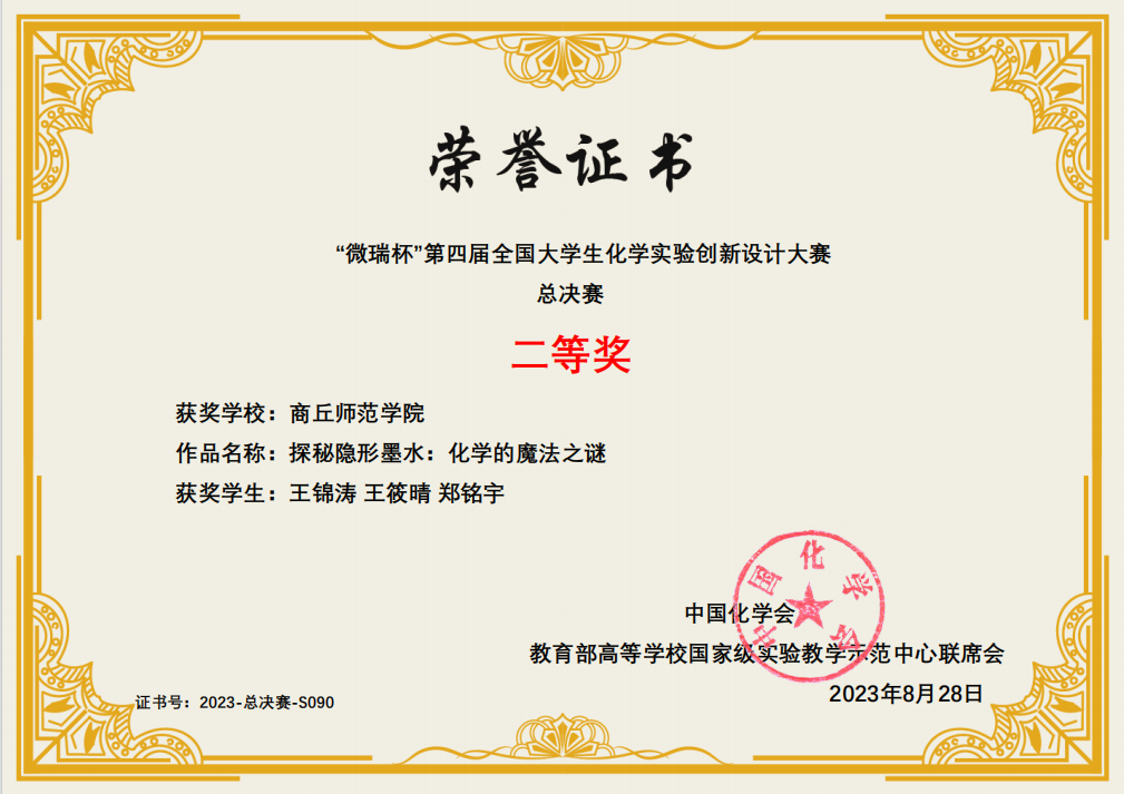 本次大赛从校赛算起,前后历经半年。beat365官网选送参加本届华中赛区竞赛的三支队伍在学院的精心组织、指导教师的全力指导和参赛同学们的努力拼搏下,王筱晴、王锦涛、郑铭宇组成的团队(指导教师:陈淑敏,王晓娟)通过科普实验项目“探秘隐形墨水:化学的魔法之谜”荣获华中赛区竞赛一等奖;张杰、孙梦盼、王赛琼组成的团队(指导教师:王晓娟,高媛媛)通过新创实验项目“(S)-二苯基脯氨醇为NMR手性分析试剂测定扁桃酸的对映体纯度”荣获华中赛区竞赛二等奖;赵书语、李佳琦、王邵丹组成的团队(指导教师:王鑫,王涛)通过改进实验项目“原电池和电解池的实验改进”荣获华中赛区竞赛三等奖。其中,科普实验项目入围全国总决赛。