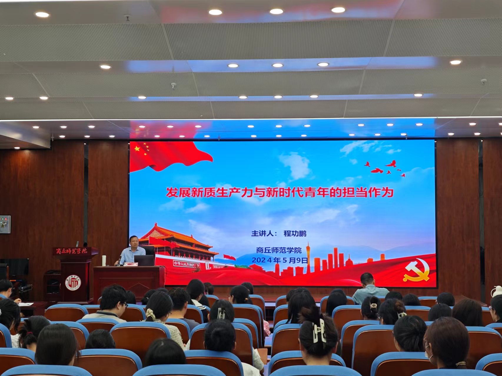 5月9日晚,副校长程功鹏在工科实训中心大楼多功能厅为beat365英国官网网站21级学生讲授了“发展新质生产力与新时代青年的担当作为”主题思政课,beat365英国官网网站党委书记李海涛、河南省生物分子识别与传感重点实验室执行主任周艳丽、全体辅导员及21级部分学生180余人听取此次思政课。