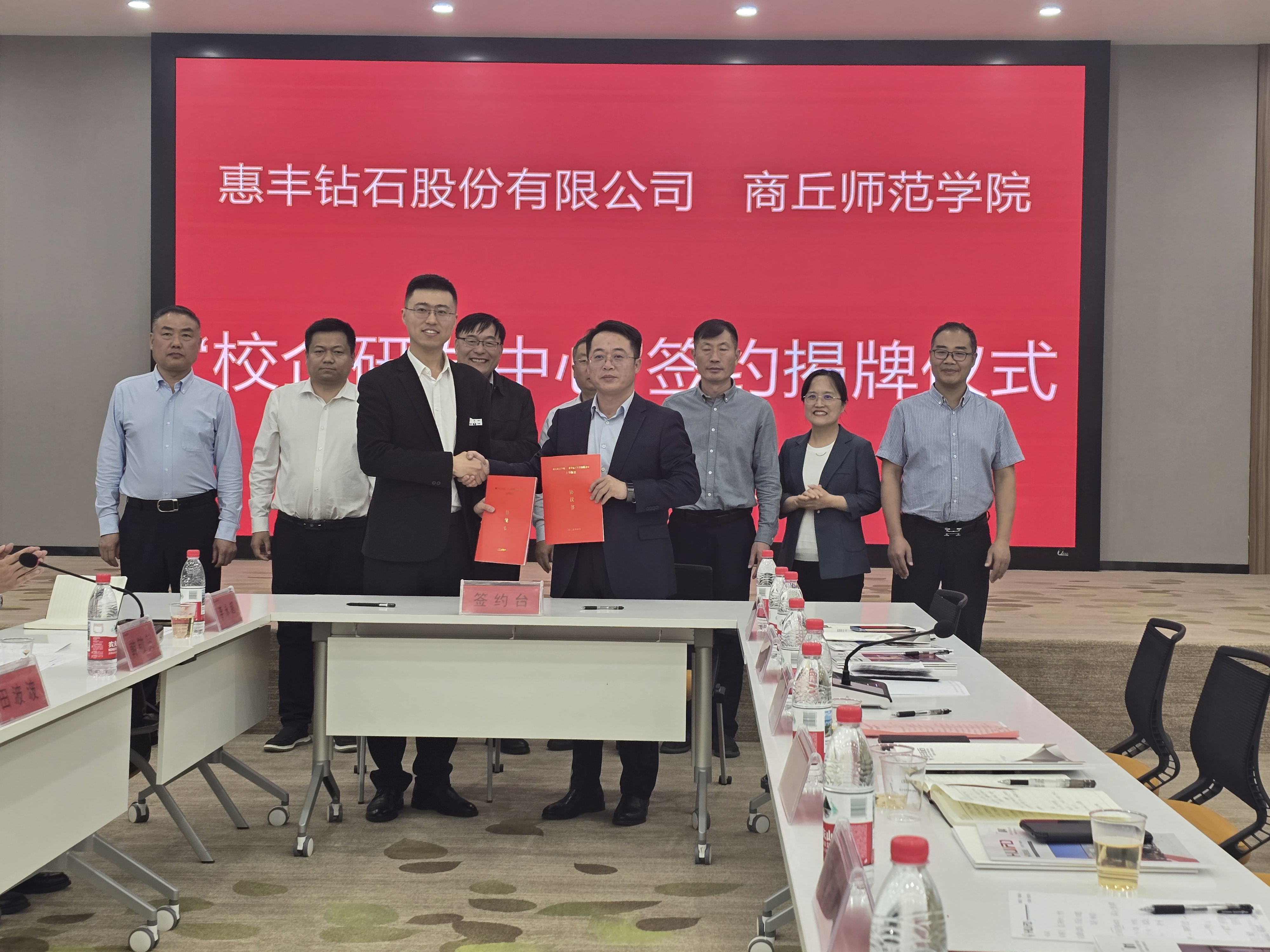 4月16日,副校长翟滨带领校地合作与服务中心、beat365英国官网网站一行7人到惠丰钻石股份有限公司举行“校企研发中心”签约揭牌仪式并进行访企拓岗活动。柘城县科技局局长田波波、副局长张涛、惠丰钻石股份有限公司总裁韩敬贺,副总经理鲍思玮、生产总部总监李永超等出席活动。