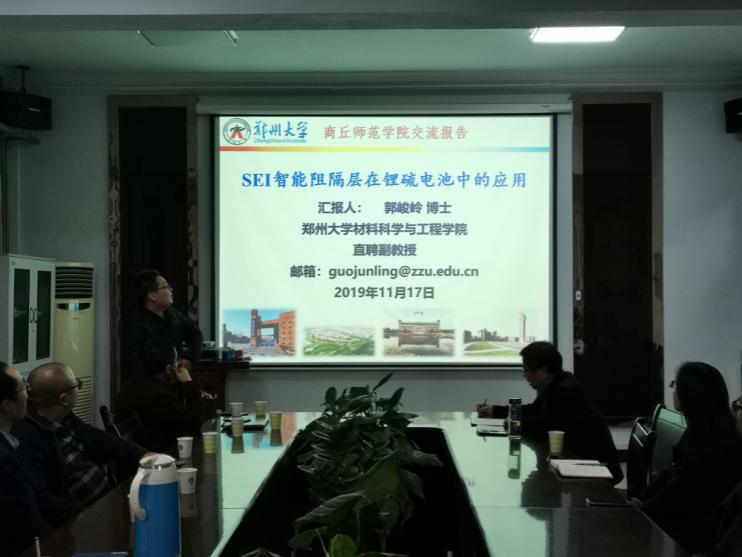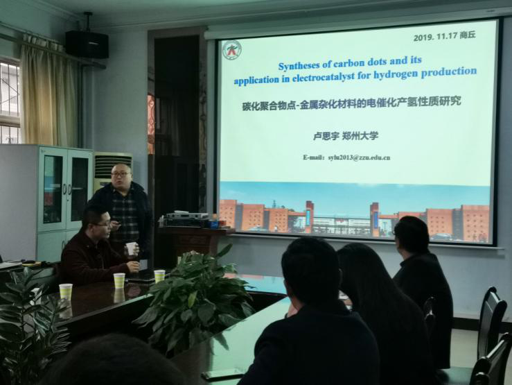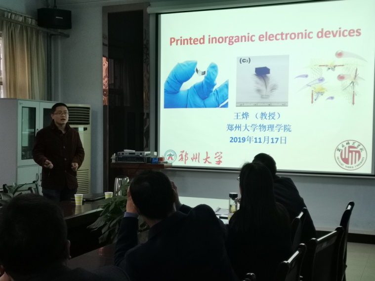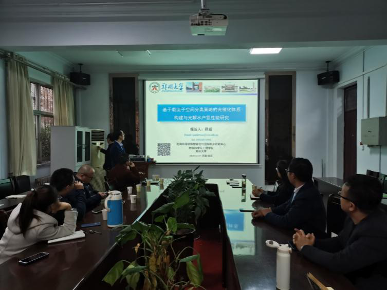 应beat365英国官网网站的邀请,11月17日,郑州大学青年拔尖人才王烨、卢思宇、薛超、郭峻岭四位博士在文化路校区beat365英国官网网站会议室分别做了题为“Printed electronic devices with inorganic materials”、“碳化聚合物点的可控制备及性质研究”、“基于载流子空间分离策略的光催化体系构建与光解水产氢性能研究以及“SEI智能阻隔层在锂硫电池中的应用”的学术报告,报告会由瞿鹏院长主持,beat365英国官网网站部分老师、研究生和本科生聆听了报告。