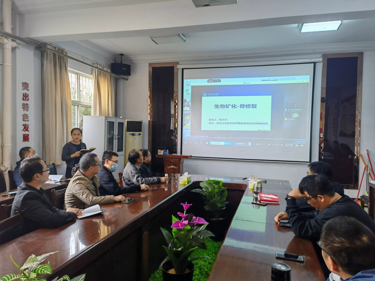 姚沙沙博士从制备仿生的小尺寸无定形磷酸钙纳米簇(CPNCs) ,利用小尺寸磷酸钙纳米簇(CPNCs)实现胶原内矿化,利用小尺寸磷酸钙纳米簇(CPNCs)实现生物体内硬组织的修复:比如,牙本质修复、骨缺损修复以及骨质疏松骨的原位治疗等三个方面介绍了自己博士和工作后所做的主要工作。相关研究成果发表在Adv. Sci., Adv. Mater.等国际知名期刊上。报告会后,各位老师与姚沙沙博士就相关问题进行了深入的讨论与交流。
