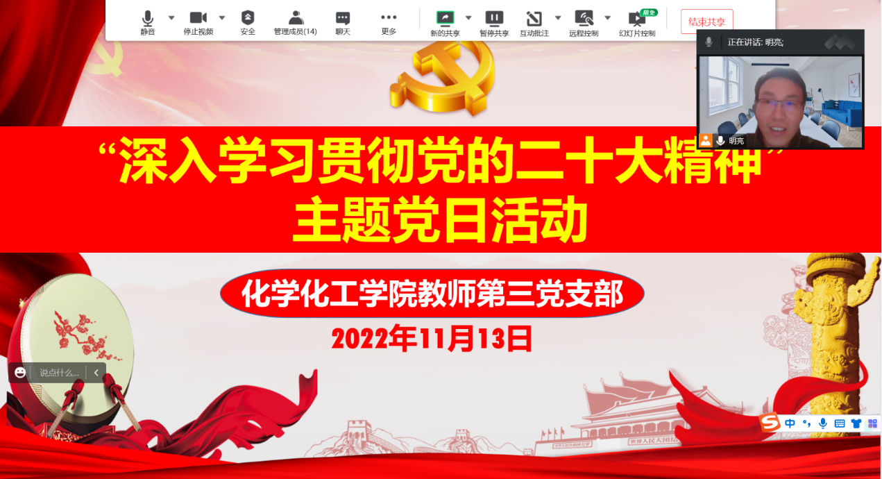 为在思想和行动上与党中央保持一致,11月13日,beat365英国官网网站教师第三党支部利用腾讯会议举行“深入学习宣传贯彻党的二十大精神”线上主题党日活动。本次活动由党支部书记张明亮同志主持,支部全体党员参与。