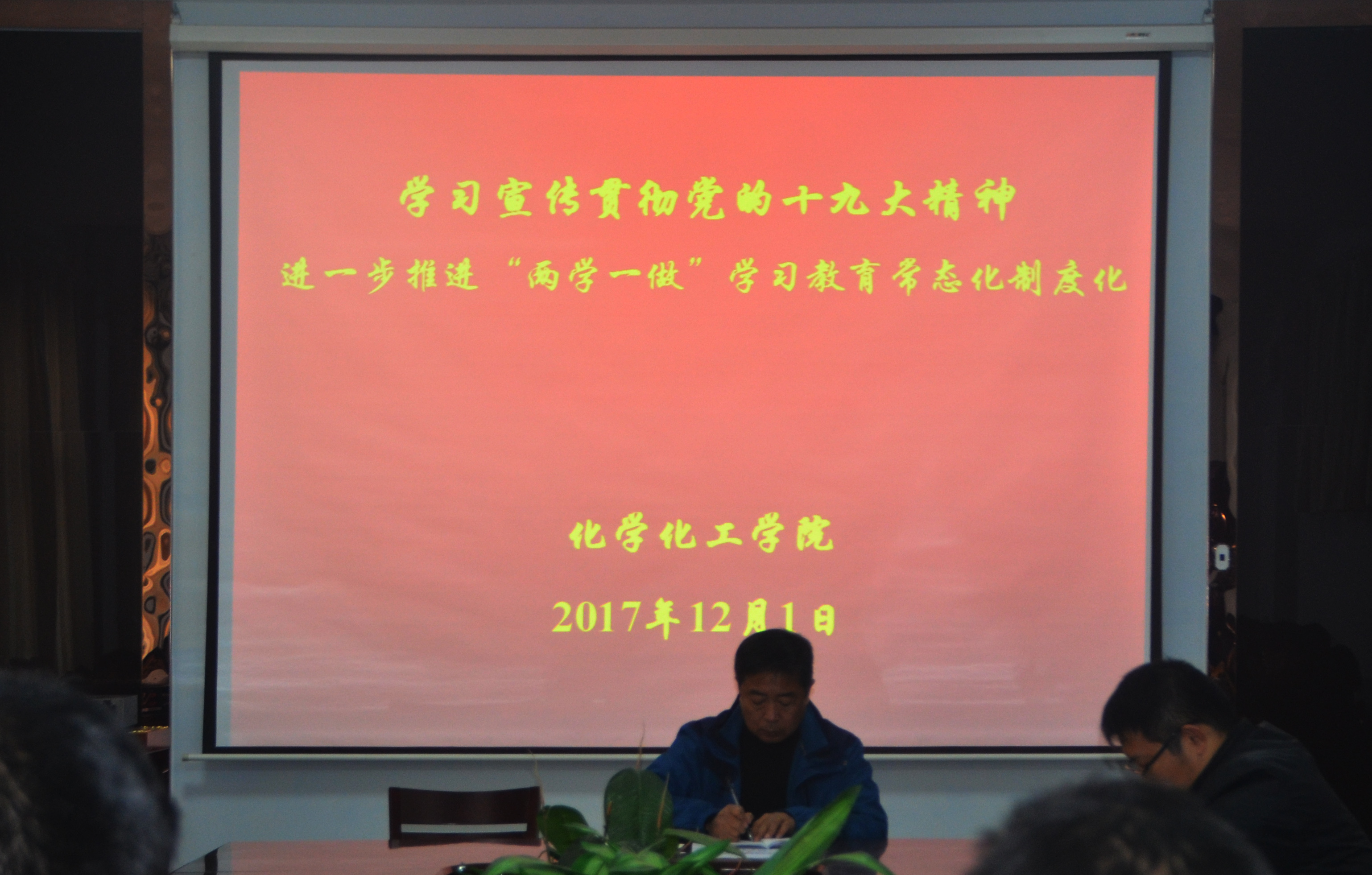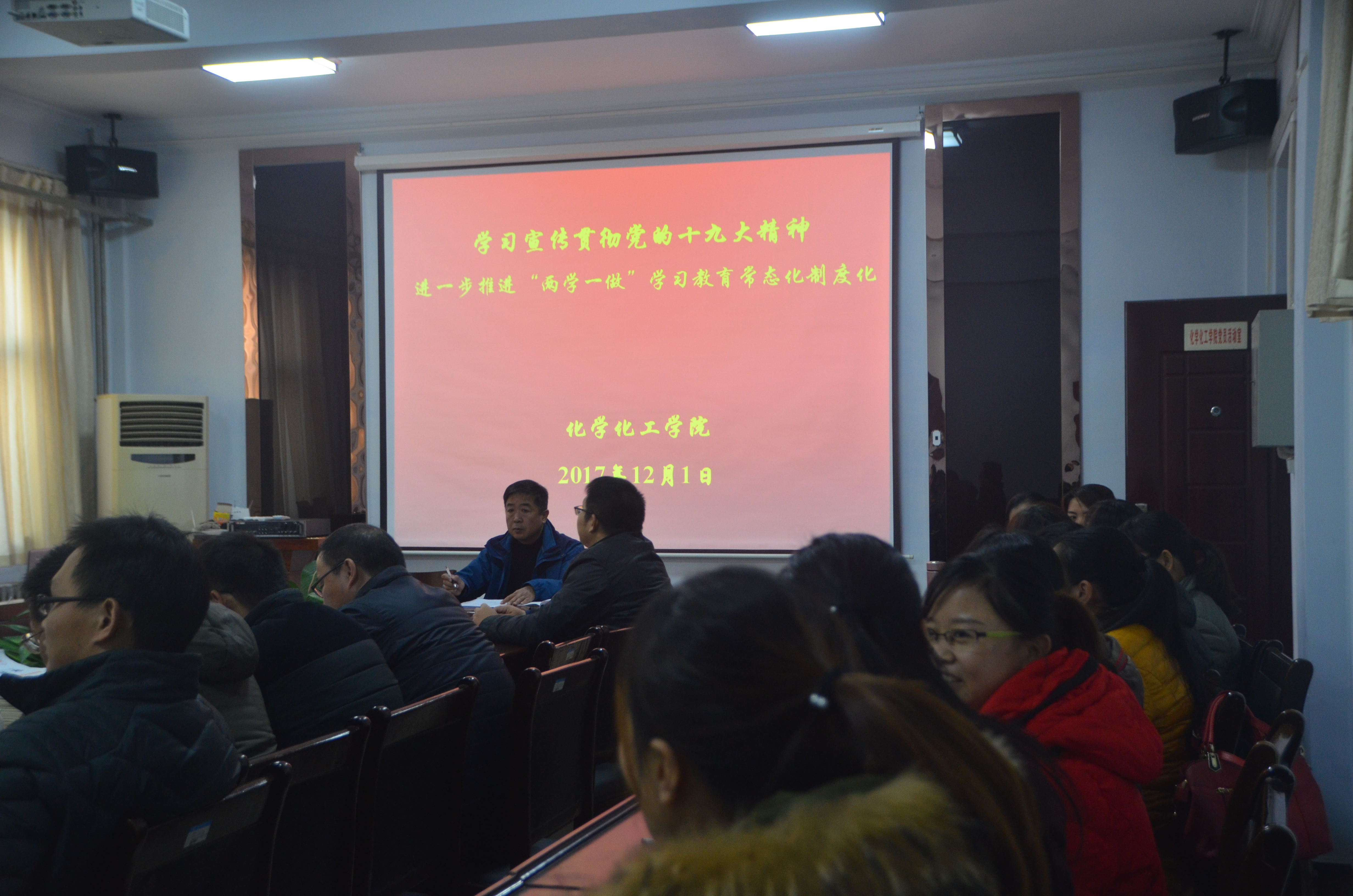 12月1日下午,beat365英国官网网站于beat365官网文化路校区7号楼院会议室召开了“学习贯彻党的十九大精神——进一步推进‘两学一做’学习教育常态化制度化”的学习交流会议。beat365英国官网网站全体教师参加了会议。会议由院党总支书记韩忠民主持。
