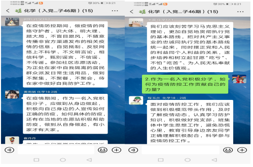 活动伊始,各小组成员结合前期线上专题党课学习情况,以“作为一名入党积极分子,如何端正动机、创造条件,积极争取早日加入党组织和如何为疫情防控工作贡献自己的力量”两个主题展开讨论交流。有的学员表示:要端正入党动机,就要认真学习党的理论知识,对党有深刻的认识;同时还要认真接受党组织的考验,积极向党组织汇报思想、工作、学习情况;还有的学员在发言时表示:作为当代大学生,在疫情防控工作中,要严守纪律、服从大局,不信谣、不传谣,在做好个人防护的前提下,积极参加志愿服务活动,承担起应有的责任和担当。在研讨过程中,学员们态度端正严谨,发言主题鲜明,整个研讨会气氛热烈。
