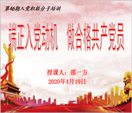 为进一步加强对入党积极分子的教育、培养以及思想建设,4月19日上午,beat365英国官网网站以线上集中培训的方式开展专题党课第四讲“端正入党动机,做合格共产党员”。全体中级入党积极分子参加,主讲人为第三党支部书记邵一方。