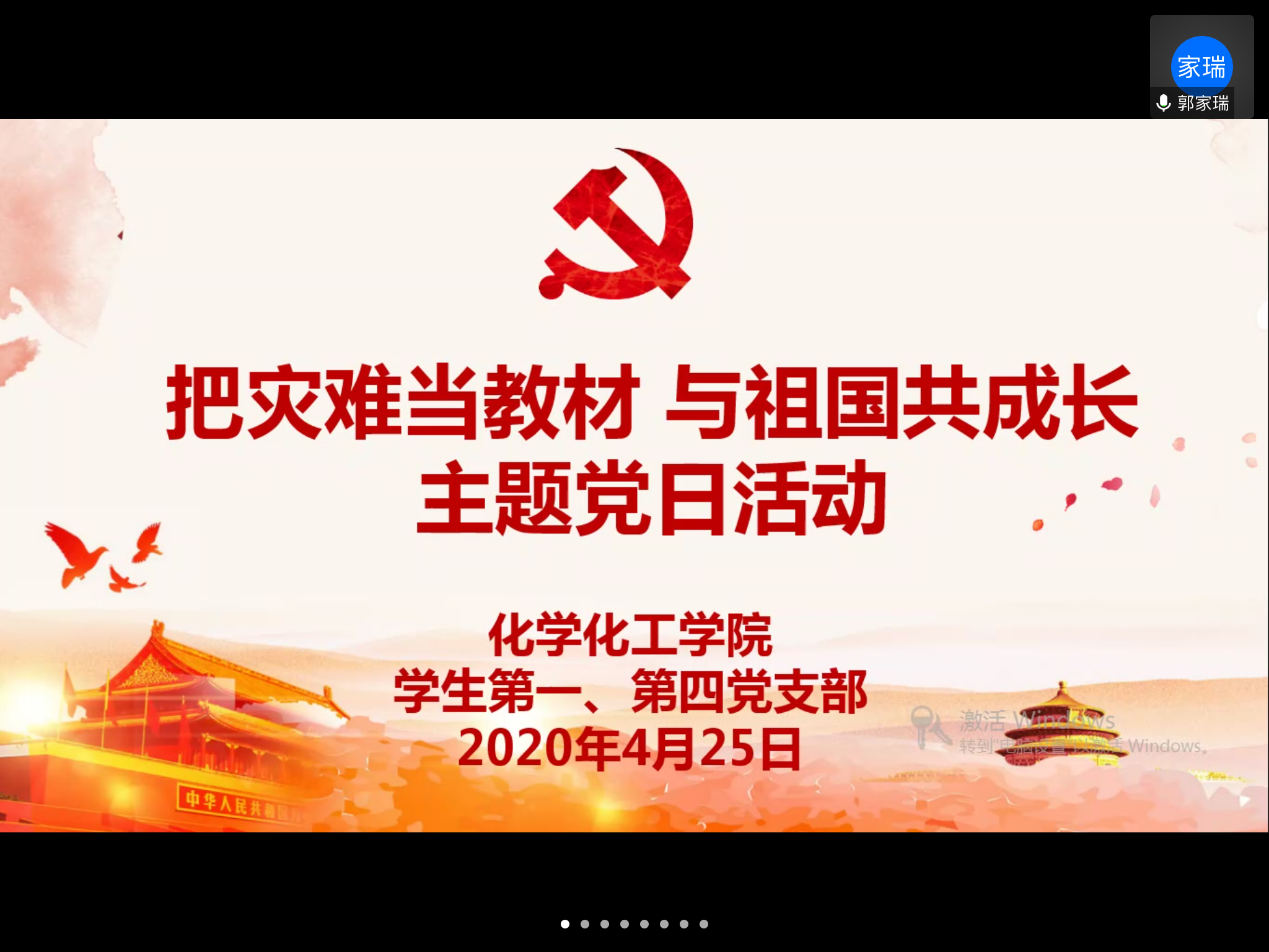 为进一步激发支部党员的责任担当和斗争精神,引导广大党员把灾难当教材、把困难当磨砺,做到在灾难面前与国家同呼吸共患难,以坚定的信心和饱满的精神状态投身“战疫”。4月25日,化学化工学院学生第一、第四党支部开展了“把灾难当教材,与祖国共成长”线上主题党日活动。第四党支部书记郭家瑞主持活动。