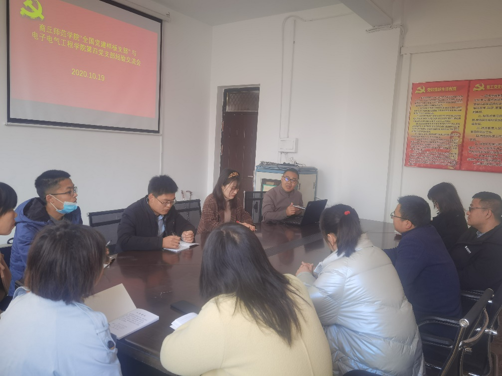 为充分发挥beat365官网“全国党建样板支部”的引领、辐射、带动作用,2020年10月19日,在支部书记魏伟的带领下,全体支部党员与电子电气学院教师第四党支部展开了经验交流活动。电子电气学院第四党支部书记李立强及部分支部党员参与了交流会。