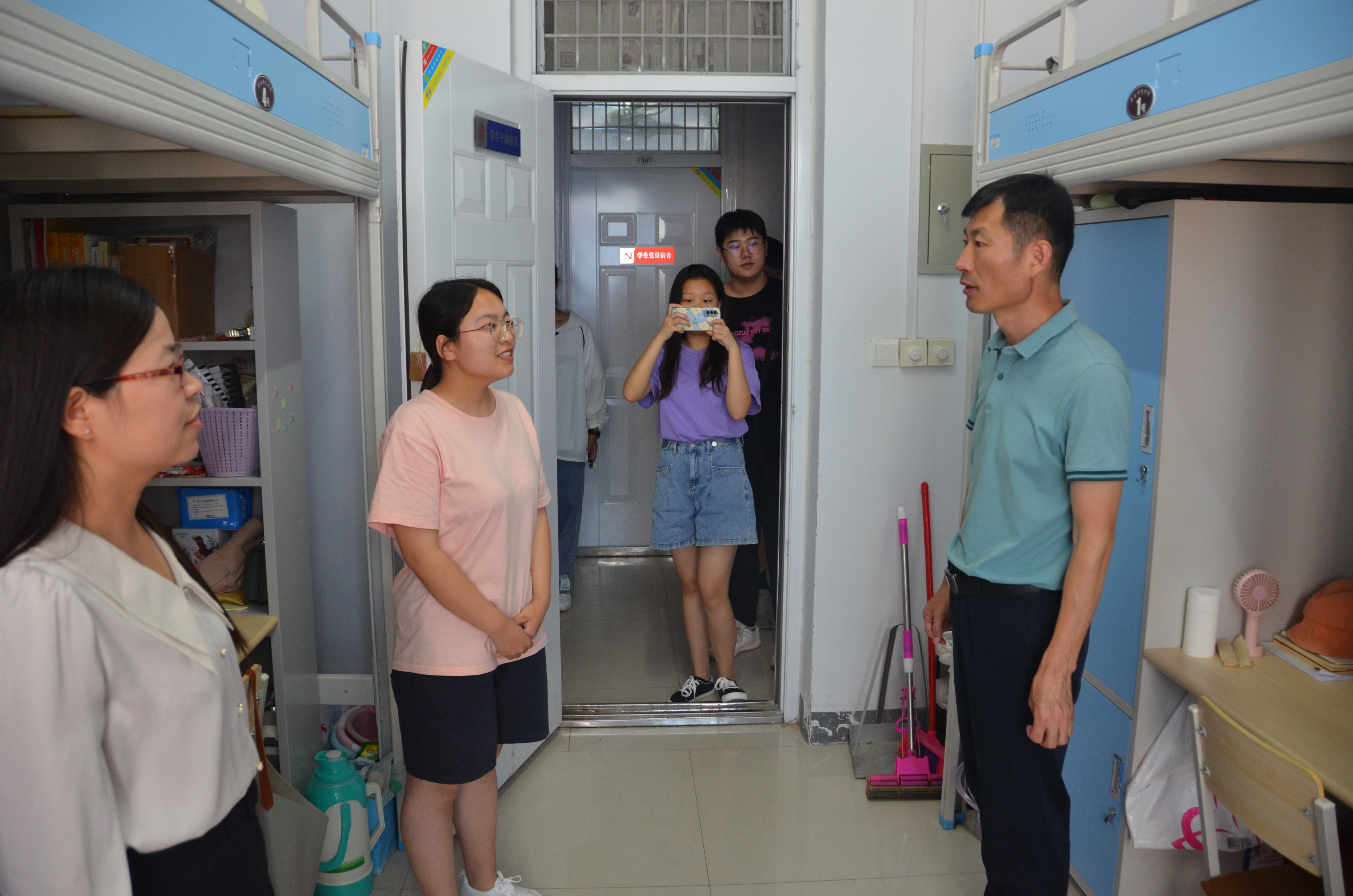 李海涛亲切与学生交流,询问学生的学习、生活情况,并肯定了学生党员在和谐宿舍建设工作中付出的努力。