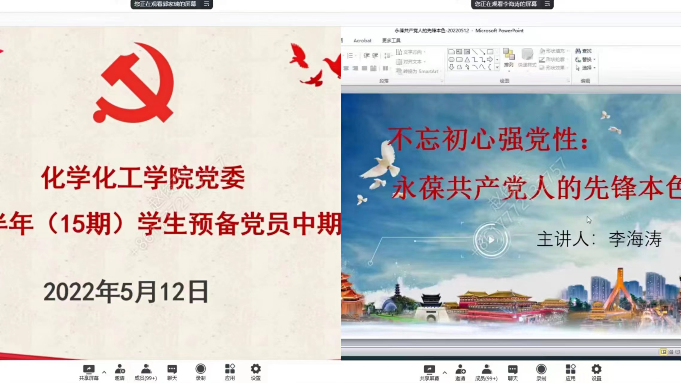 5月12日,beat365英国官网网站党委开展了2022年上半年(15期)学生预备党员中期培训专题党课第一讲,由院党委书记李海涛主讲,学生党支部书记和全体学生党员参加。