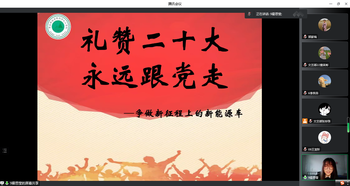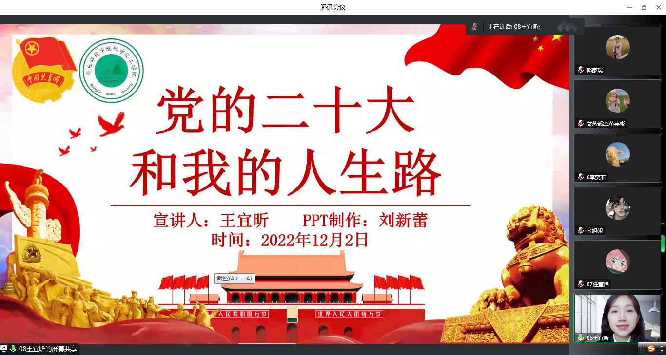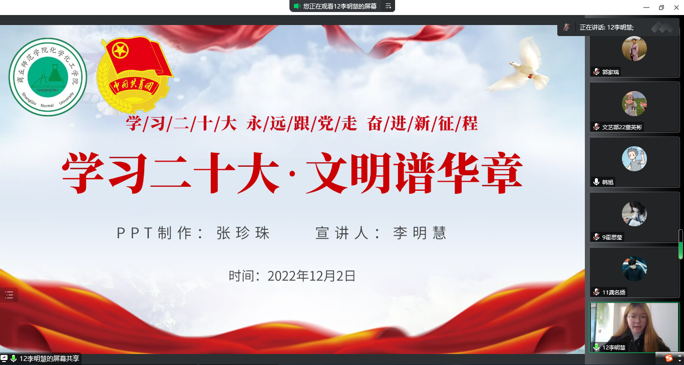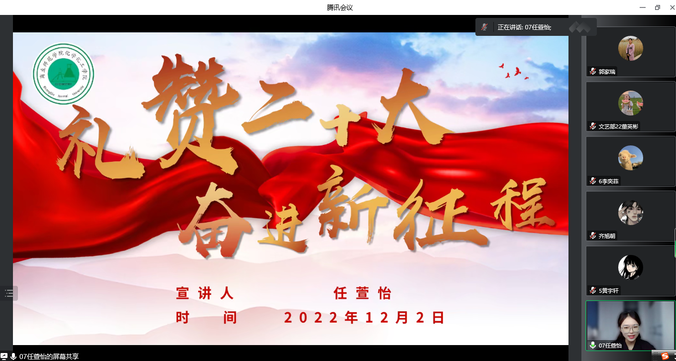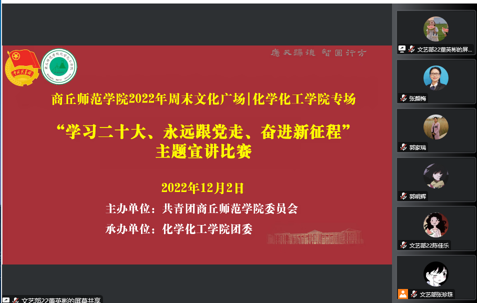 为引导广大青年学生认真研读党的二十大报告,进一步推动党的二十大精神在青年学生中入脑入心,12月2日下午,beat365英国官网网站2022年周末文化广场beat365英国官网网站专场活动中,beat365英国官网网站团委在线举办了“学习二十大、永远跟党走、奋进新征程”主题宣讲比赛。特邀嘉宾校团委副书记徐航、院党委副书记张颜梅莅临本次活动进行指导,院团委副书记郭家瑞、21级辅导员郭冠群、院团委学生会各部门负责人及学生代表观看了比赛。