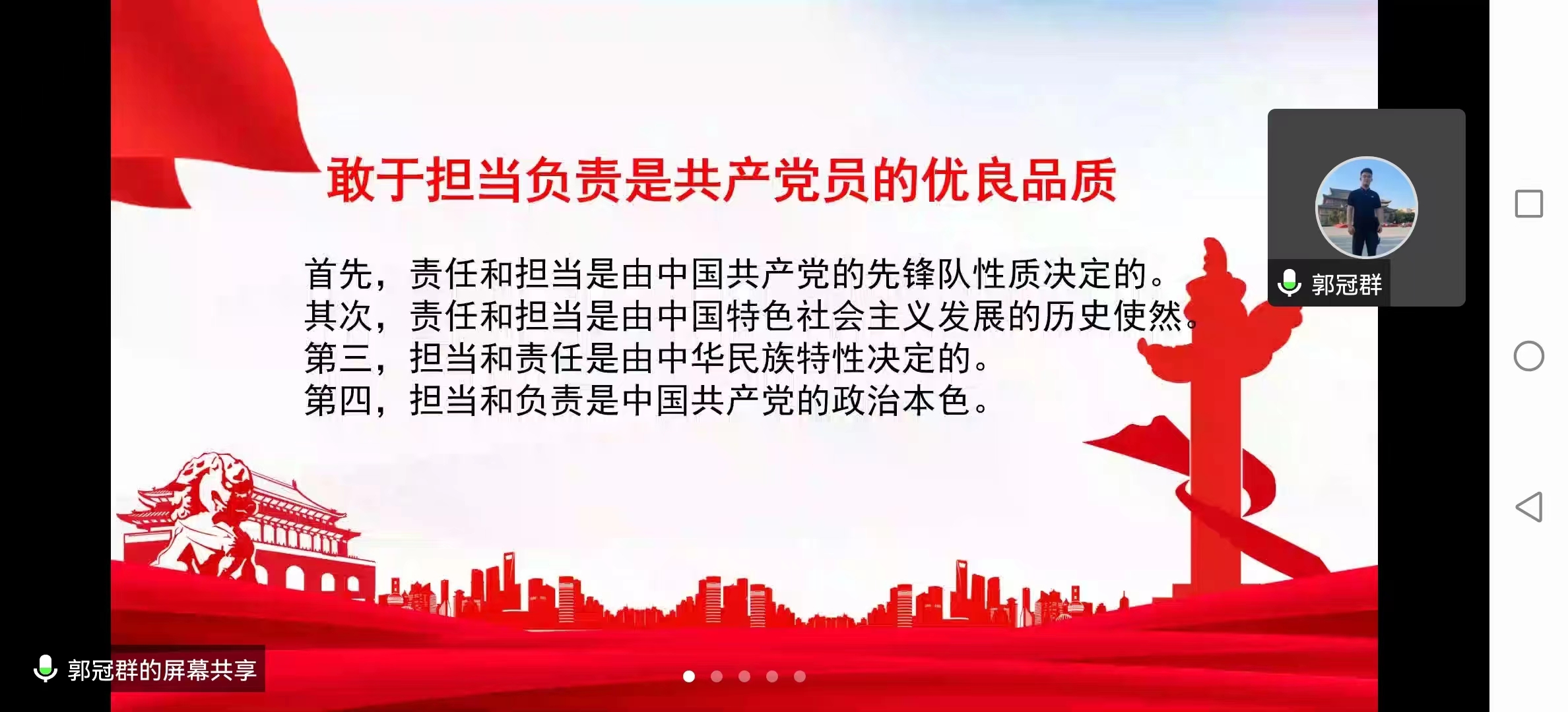 郭冠群从“敢于担当责任是中共党员的优良品质、是从严治党的现实选择以及中国共产党员如何做到敢于担当责任”三个方面深刻阐释了中国共产党员具有责任担当的重大意义及本质要求。郭冠群指出,作为新时代党员,要认清自身责任,做到坚定理想信念,敢担当、能吃苦、肯奋斗。