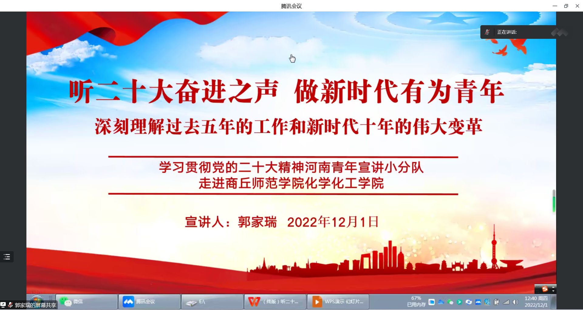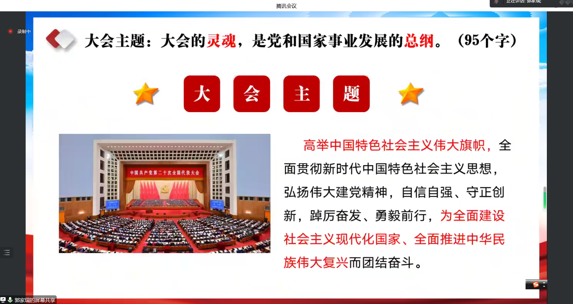 郭家瑞从“大会主题阐释、深刻理解过去五年的工作和新时代十年的伟大变革、做新时代奋进有为青年”三个方面解读了大会主题的深刻内涵,通过丰富的案例展示了新时代十年党和国家事业取得的伟大变革和伟大成就,引领大家深刻理解新时代十年的伟大变革根本在于有以习近平同志为核心的党中央的运筹帷幄,在于有习近平新时代中国特色社会主义思想的举旗定向,“两个确立”从根本上推动着党和国家事业行稳致远,在百年变局中不断开拓新局面。并号召大家,要牢记习近平总书记和人民的嘱托,立志做有理想、敢担当、能吃苦、肯奋斗的新时代青年。