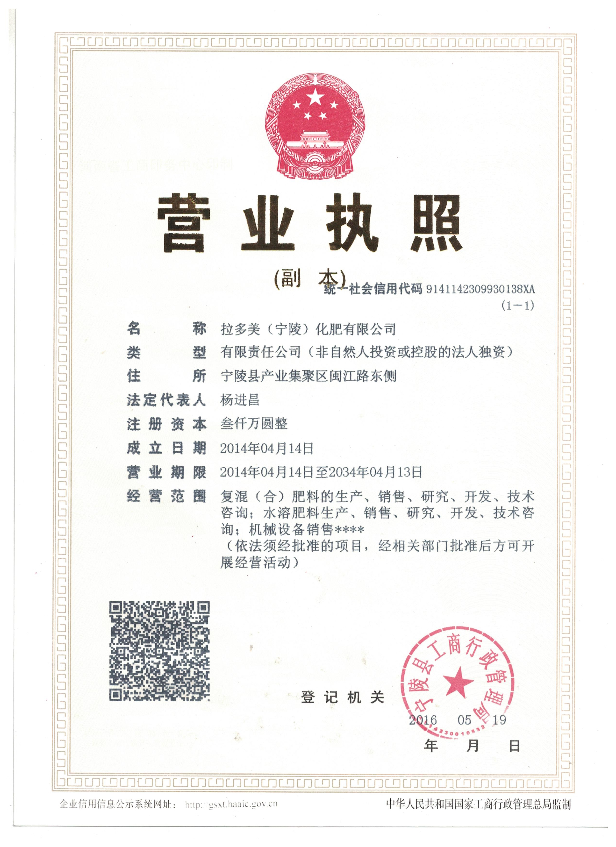 拉多美(宁陵)化肥有限公司(简称:拉多美宁陵公司)是广东拉多美化肥有限公司全资控股子公司,位于河南省商丘市宁陵县产业集聚区闽江路东侧,成立于 2014 年4月,是一家集新型复合肥研究、开发、生产、销售为一体的高新技术企业。自成立以来一直秉承“造福中国农民”的使命,坚持“共同益智、共同发展、共同欢乐”的核心价值观,期望为拉多美品牌相关者创造幸福生活。