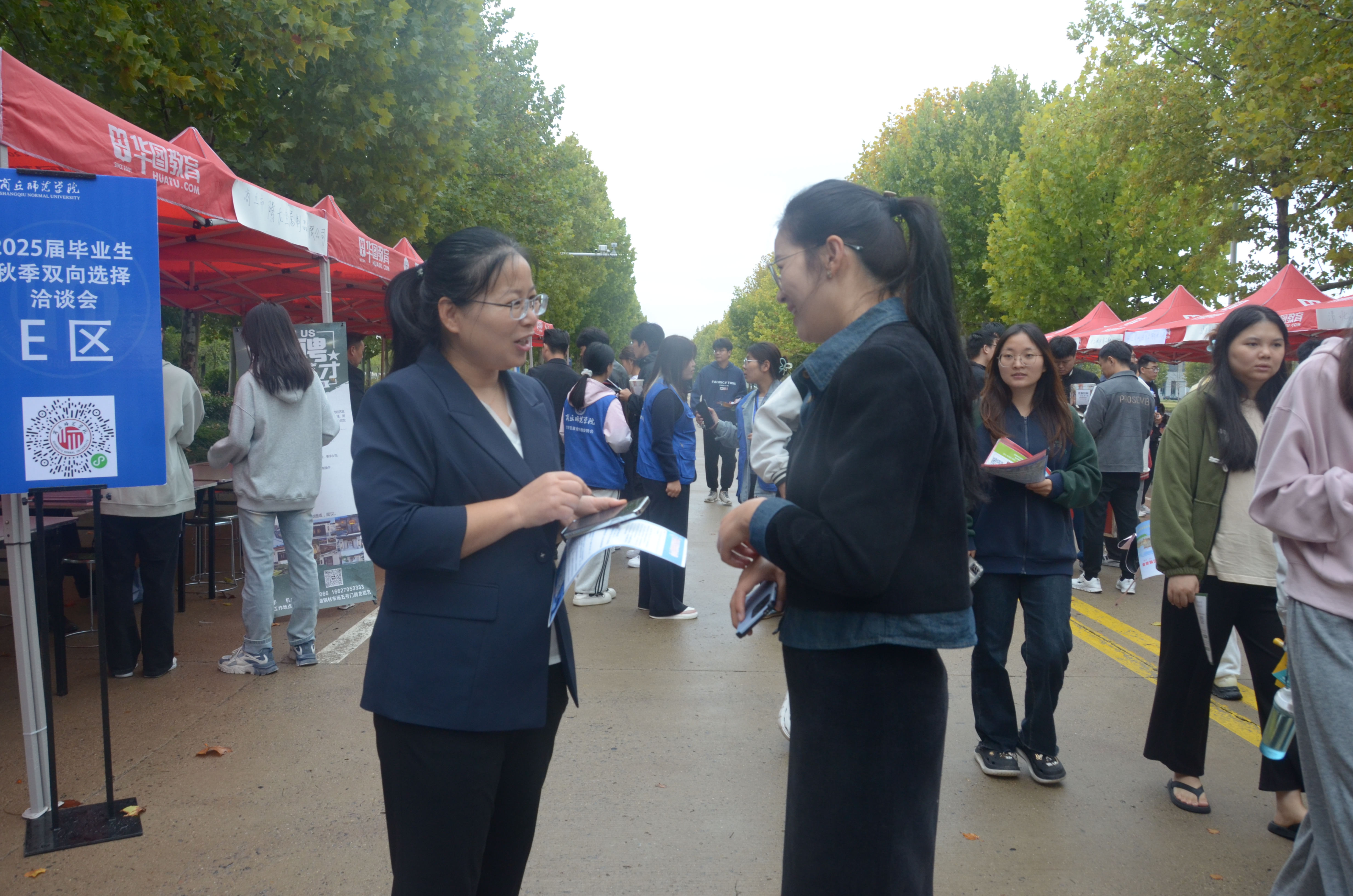 学院党委副书记张颜梅带领2025届毕业生辅导员郭家瑞来到洽谈会现场,深入了解了各用人单位的企业文化、岗位职责和职业要求,以便更好地为毕业生就业问题做出指导并为学生们解答求职过程中的各种问题。