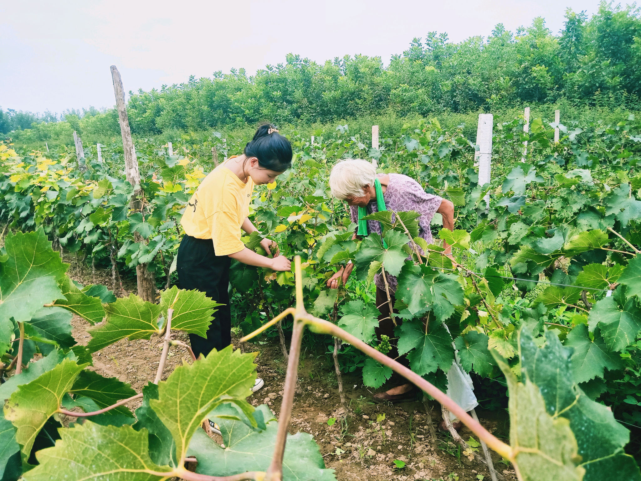 7月22日,团队成员陈辛顺前往河南信阳一户人家帮助村民采摘葡萄。天气虽有好转,依旧阴雨绵绵,陈辛顺跟随村民一起来到葡萄架下采摘,第二天去市场售卖。大串的葡萄已经成熟,村民们心中高兴,今年会有一个好收成。