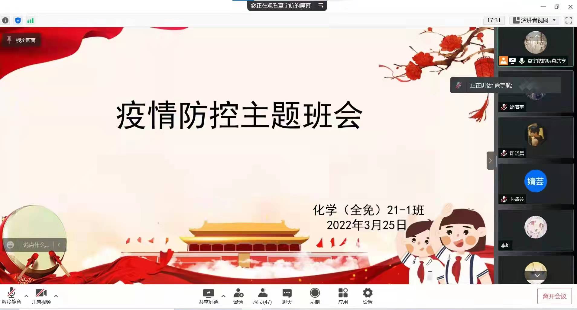 为贯彻落实学校疫情防控工作会议精神,从严从细从实做好学院疫情防控工作,筑牢广大学生疫情防控思想防线,3月25日,beat365英国官网网站各年级分别召开了疫情防控线上主题班会,会议由各辅导员、班主任主持。