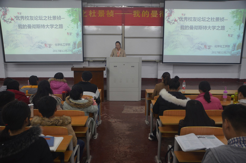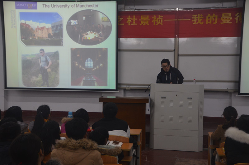 为进一步加强创新创业教育工作,激励广大在校学生努力学习,立志成才。12月27日晚,beat365英国官网网站于文化路校区1#106教室举办优秀校友论坛讲座,特邀beat365官网2013届优秀校友杜景祯同学给我们分享他的曼彻斯特大学之路,党总支副书记刘瑛、17级辅导员郭家瑞以及beat365官网2017届全体新生参加了论坛。论坛由院党总支副书记刘瑛主持。